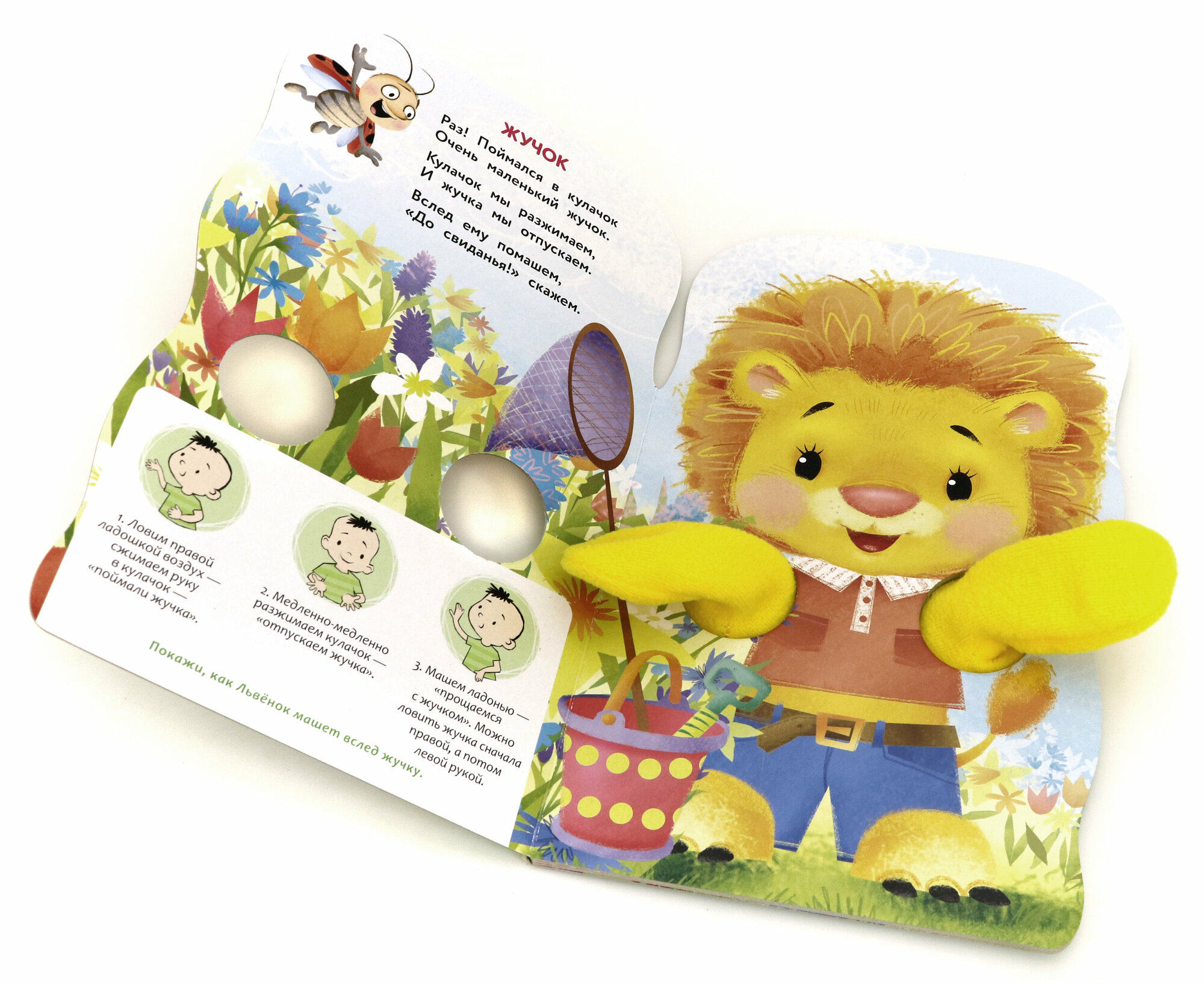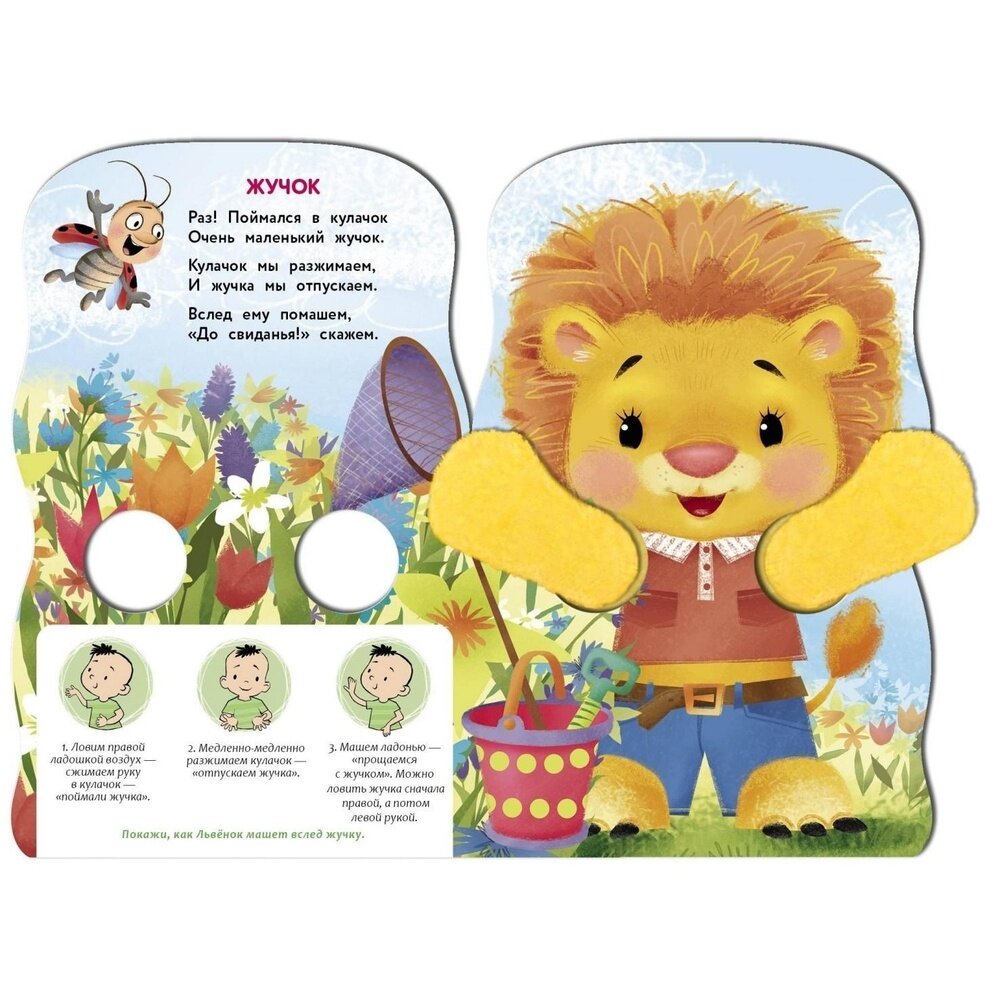 Отличная книга-игрушка среднего размера точно понравится малышу. В книге 4 разворота, где написаны 4 стихотворения. Во время чтения стиха надо делать пальчиковую гимнастику. Львёнок здесь выступает в роли забавного друга, который приветствует, хвалит и т.д. Малыш делает гимнастику, повторяя за мамой движения и получает поощрение от львёнка. Подросший малыш тоже захочет побыть в роли львёнка, так что это классная книга! Картон достаточно плотный, иллюстрации яркие, крупные. Лапки из фетра. Фетр по толщине средний, не очень тонкий, но и не толстый, к книге прикреплен надёжно, аккуратно. Рекомендую!