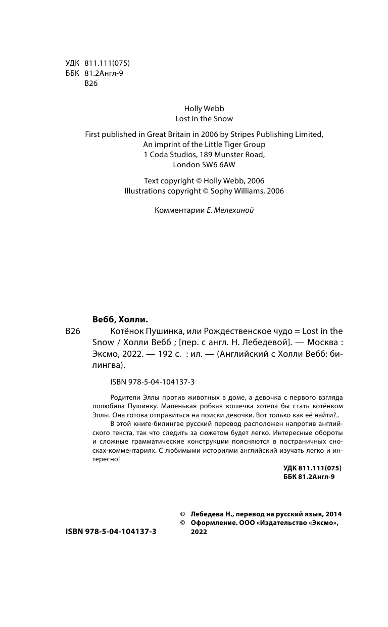 Очень впечатлила книга в новом формате: на русском и английском одновременно. Книга Холли Вебб стала не только интересной, но и обучающей! Ребенок с интересом читает ее на английском языке. Русский текст на соседней странице помогает переводить незнакомые английские слова, не отвлекаясь на словари и электронные переводчики. Теперь мы изучаем граматику на практике. Особая благодарность составителям книги за сноски внизу страниц. В них четко описывается почему применяется тот или иной оборот речи, глагол и прочее. С удовольствием читаем!