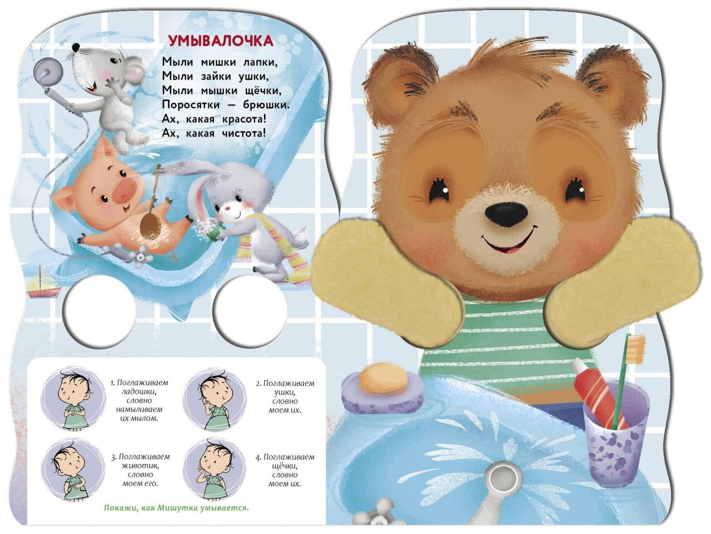 -все стихотворения сопровождаются пальчиковыми играми, описание дано под каждым стихотворением. Все действия знакомые и понятные. Уверена, что моему сыну бы понравилось и кашку варить, и сахар насыпать, и умываться, и грозить пальчиком комару, и печь пирожки. В общем, всерьёз подумываю оставить эту книжку себе, а в подарок купить ещё одну, время позволяет.