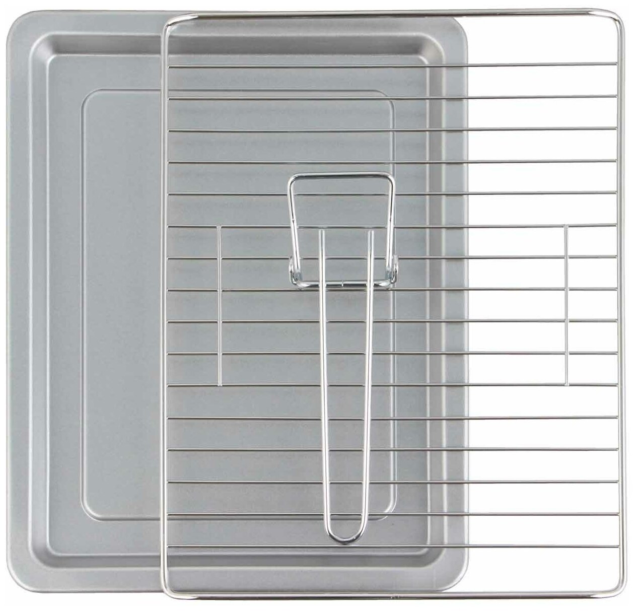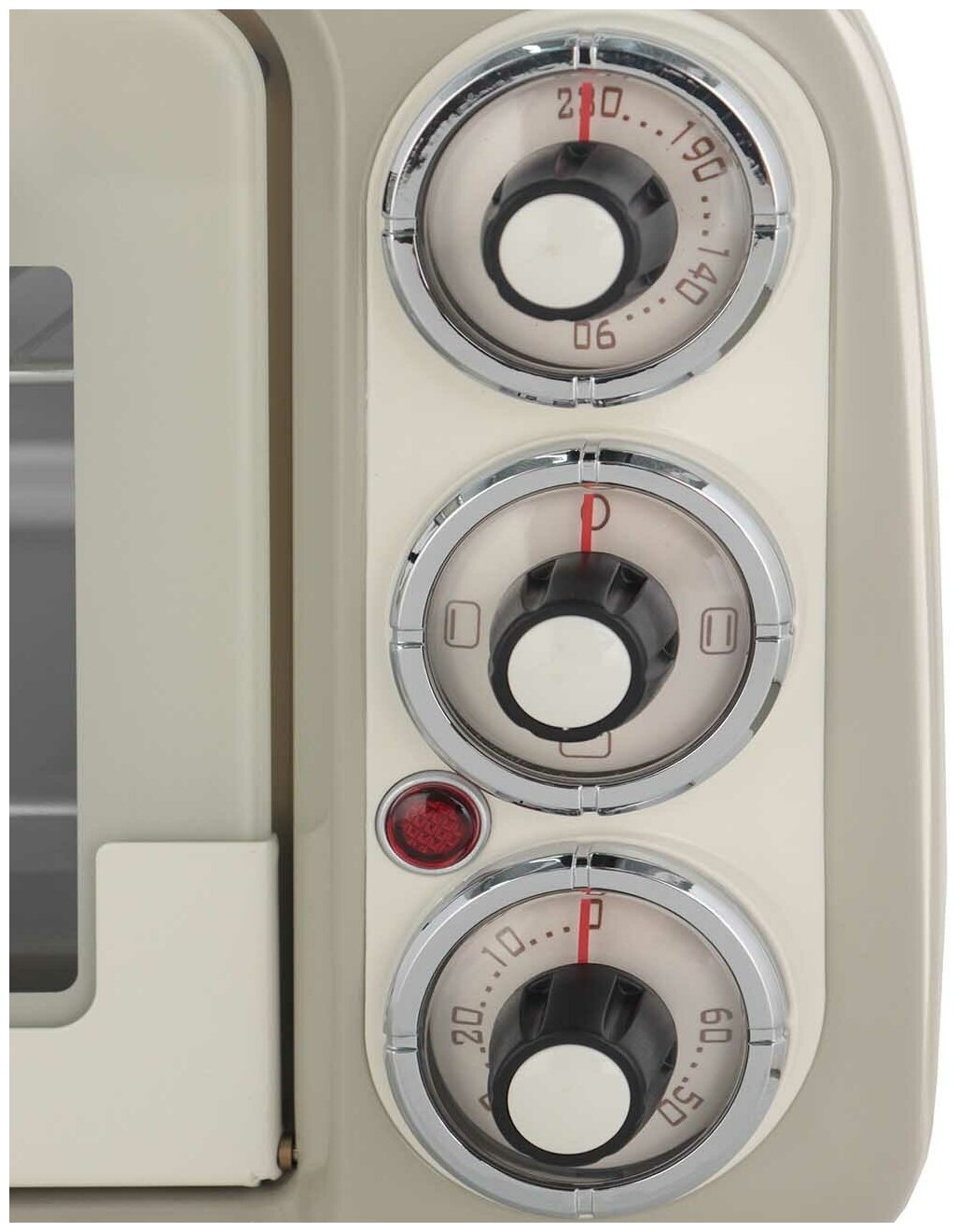 Работает отдельно верхний или нижний нагрев, можно включать два нагрева одновременно. Управление происходит за счет поворотных ручек. Дверцы открываются вниз. Есть встроенный индикатор температуры и термостат.