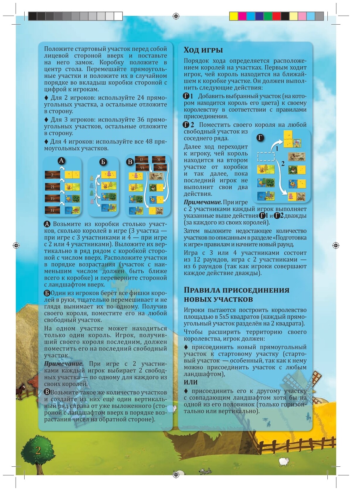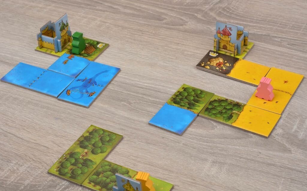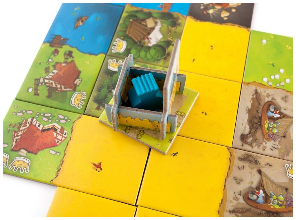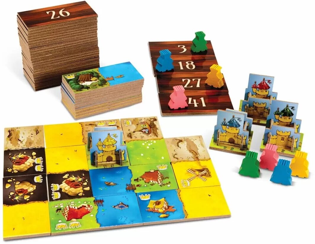 | Комплектация | 4 квадратных стартовых участка, 48 двусторонних участков, 4 замка, 8 фишек королей 4 цветов, правила игры |