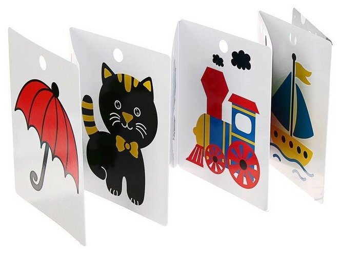 Книжка-раскладушка «РАЗВИВАЕМ ЗРЕНИЕ от 0 до 6 месяцев» – это набор из 8 двусторонних картинок, которые раскладываются гармошкой.