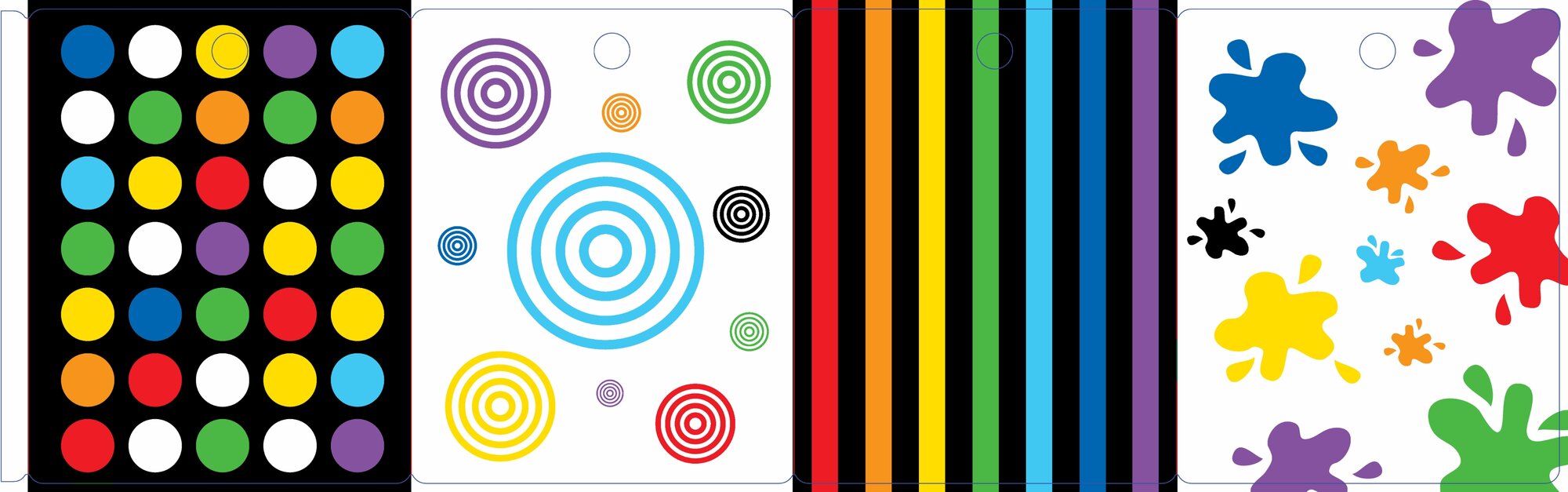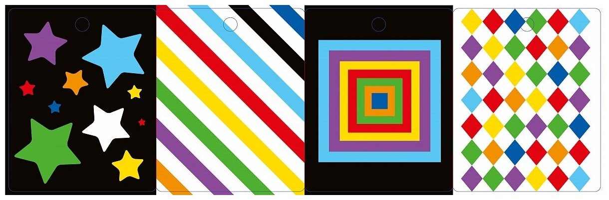 .С одной стороны вы найдёте 8 абстрактных изображений, а с другой – 8 картинок с простыми объектами, которые окрашены в яркие и чистые цвета – 7 цветов радуги, чёрный и белый.