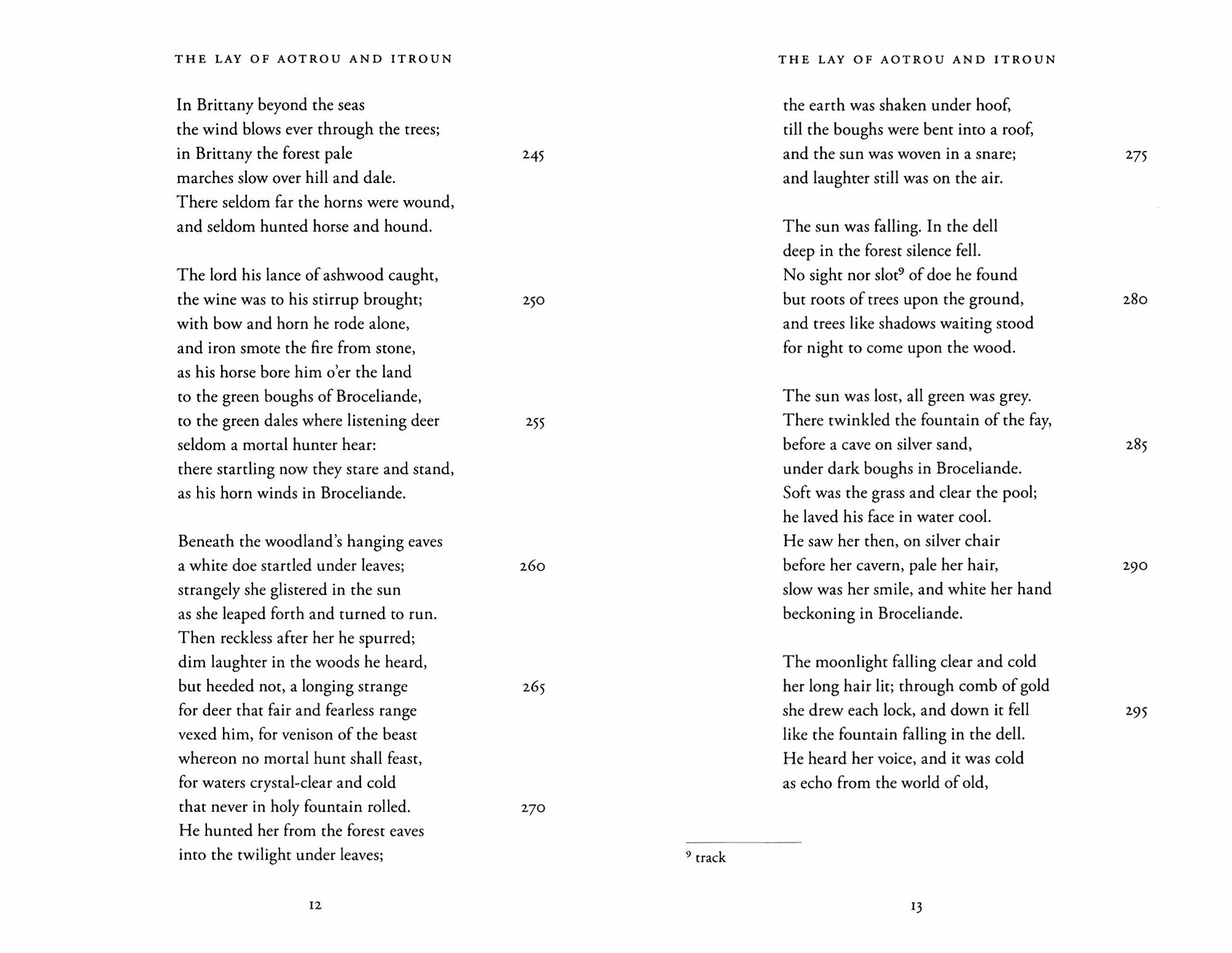 Set 'In Britain's land beyond the seas' during the Age of Chivalry, The Lay of Aotrou and Itroun tells of a childless Breton Lord and Lady ('Aotrou' and 'Itroun') and the tragedy that befalls them when Aotrou seeks to remedy their situation with the aid of a magic potion obtained from a corrigan, or malevolent fairy. When the potion succeeds and Itroun bears twins, the corrigan returns seeking her fee, and Aotrou is forced to choose between betraying his marriage and losing his life.
