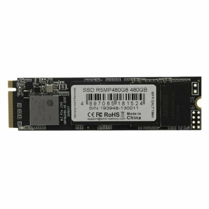 SSD M.2 накопитель AMD Radeon R5 NVMe Series [] имеет значительный объем: величина этого показателя составляет 480 ГБ. Перед вами – скоростное твердотельное устройство, обмен данными с которым производится с использованием интерфейса PCI-E 3.0 x4. Модель обладает совместимостью с портативными и стационарными компьютерами, в которых реализована поддержка технологии NVMe. Форм-фактор накопителя – 2280. Тип ключа – M. SSD M.2 накопитель AMD Radeon R5 NVMe Series [] способен обеспечить скорость последовательноготения, максимальное значение которой составляет 2100 МБ/с. Максимальная скорость последовательной записи – 1600 МБ/с. Устройство управляется широко распространенным контролером Silicon Motion SM2263. Типипов памяти – TLC 3D NAND. Накопитель имеет одностороннюю компоновкуипов памяти. Устройство произведено с использованием привлекательно выглядящего темно-синего текстолита. Роль упаковки устройства исполняет блистер, конструкция которого позволяет ознакомиться с внешним видом содержимого без распаковки.