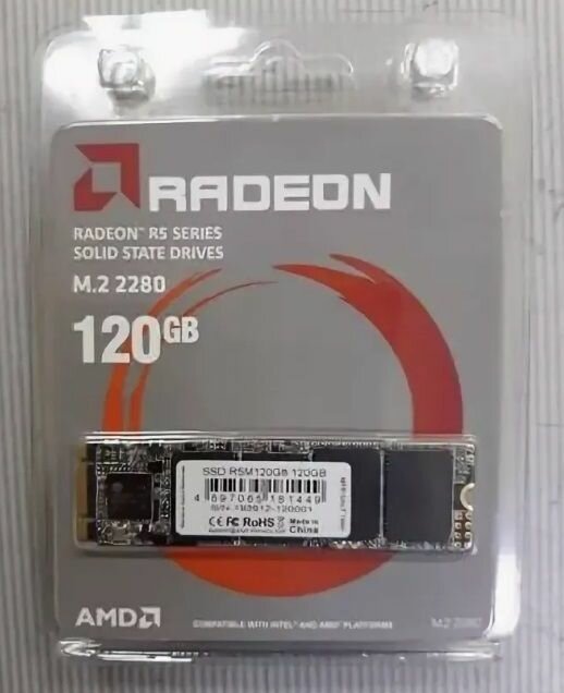 120-гигабайтный SSD M.2 накопитель AMD Radeon R5 Series [] является отличным вариантом для использования в качестве системного диска. Этот компактный (а использование интерфейса M.2 автоматически подразумевает компактность устройства) накопитель, соответствующий форм-фактору 2280, использует память TLC 3D NAND. Устройство подойдет для установки в мобильные и стационарные компьютеры, допускающие использование M.2-совместимой техники. SSD M.2 накопитель AMD Radeon R5 Series [] характеризуется максимальными скоростями последовательноготения и последовательной записи, равными 530 и 330 МБ/с соответственно. Эти показатели обуславливают уровень эффективности, достаточный для качественной работы в составе производительной системы. Как и подавляющее большинство твердотельных накопителей, накопитель AMD Radeon R5 Series [] отличается впечатляющим уровнем надежности, о котором свидетельствует величина MTBF, равная 1.5 миллионамасов. Модель упакована в компактный блистер, украшенный символикой производителя.