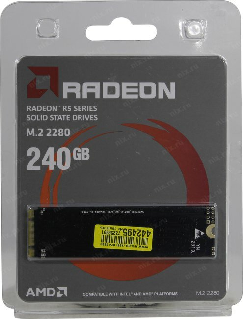 Соответствующий форм-фактору 2280 SSD M.2 накопитель AMD Radeon R5 Series [] станет отличным выбором для пользователей мобильных и стационарных компьютеров, допускающих установку M.2-совместимых устройств, но лишенных поддержки технологии NVMe. Для обмена данными с накопителем используется интерфейс SATA 3. Используемые для установки ключи – B и M. SSD M.2 накопитель AMD Radeon R5 Series [] имеет объем, равный 240 ГБ. Модель обеспечивает типовой для SATA-совместимых твердотельных накопителей уровень производительности. Скорость последовательноготения может достигать 530 МБ/с. Соответствующий показатель для записи – 450 МБ/с. Быстродействие накопителя достаточно для эффективного исполнения роли системного диска в большинстве компьютеров. О надежности устройства свидетельствует показатель MTBF, составляющий 1.5 миллионаасов. При производстве накопителя был использован темно-синий текстолит. Компоновкаипов памяти – двусторонняя. Устройство упаковано в пластиковый блистер. На упаковке размещена базовая информация о модели.