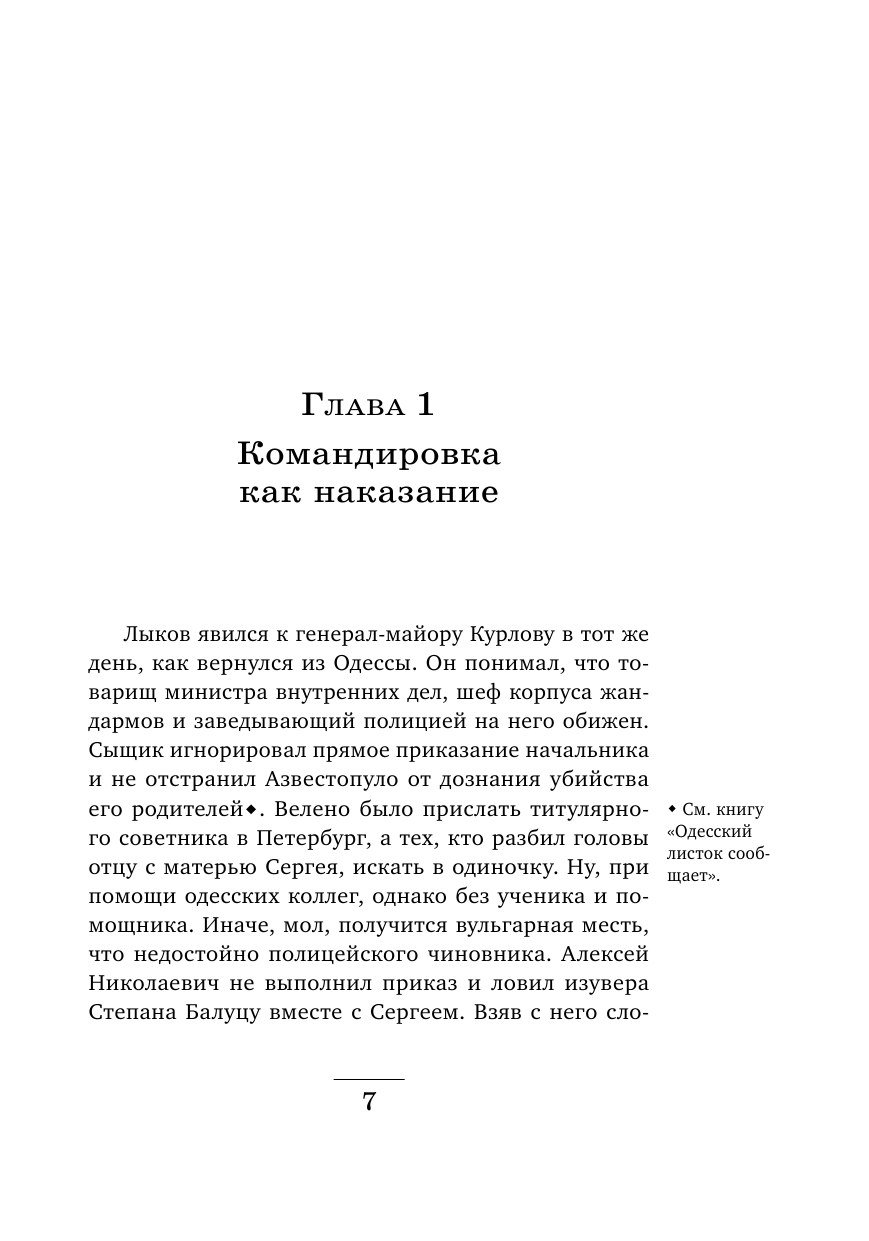 Отличная книга. Творчество данного писателя открыл для себя три года назад и конечно перечитал все его книги до последней. Сейчас отслеживаю все появившиеся новинки. Автор большая умница: произведения наполнены историческими фактами конца 19- начала 20 веков, описаны реформы полиции того времени, их достижения и промахи. Мне очень показалось интересным больше узнать для себя о том периоде, особенно о работе полиции того времени. Для меня многие факты о выстроенной правоохранительной системе того времени были открытием....