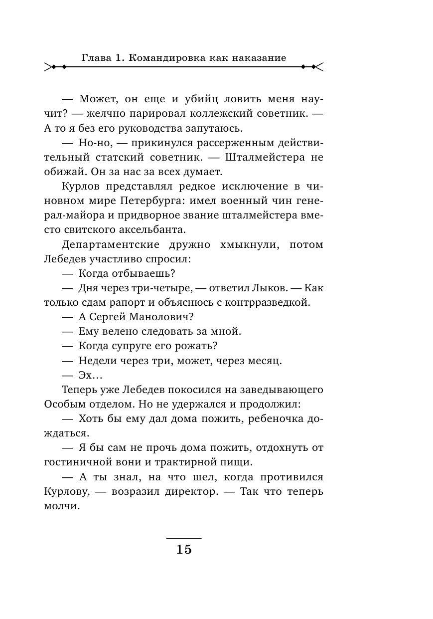 В этой книге, об очередных приключениях, уже полковника, Лыкова, пожалуй наибольший интерес представляют именно исторические зарисовки и описания жизни Туруханского края, Иркутска, чалдонов. Очень интересна была и шпионская история. Красочно описана золотодобыча. Что до Лыкова -то, в принципе, ничего нового, уже - как под копирку. Но написано хорошо, читается быстро.