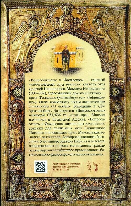 Издательство "Сибирская Благозвонница" представляет вниманию православного читателя главный экзегетический труд великого святого отца Древней Церкви преп. Максима Исповедника (580-662) "Вопросоответы к Фалассию", адресованный другому святому - преп. Фалассию (Ливийскому, или Африканскому). "Вопросоответы к Фалассию" посвящены толкованию трудных для понимания мест Священного Писания и показывают преп. Максима как великого мыслителя, богопросвещенного богослова и блестящего знатока Библии и экзегета, открывающего в своих толкованиях грандиозную картину глубинного богословского-философского миросозерцания. Перевод, предисловие и обширные комментарии выполнены профессором Московской духовной академии, доктором церковной истории А. И. Сидоровым.