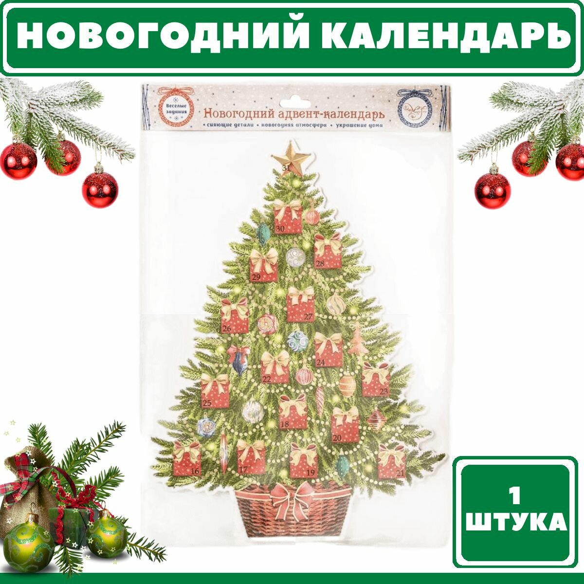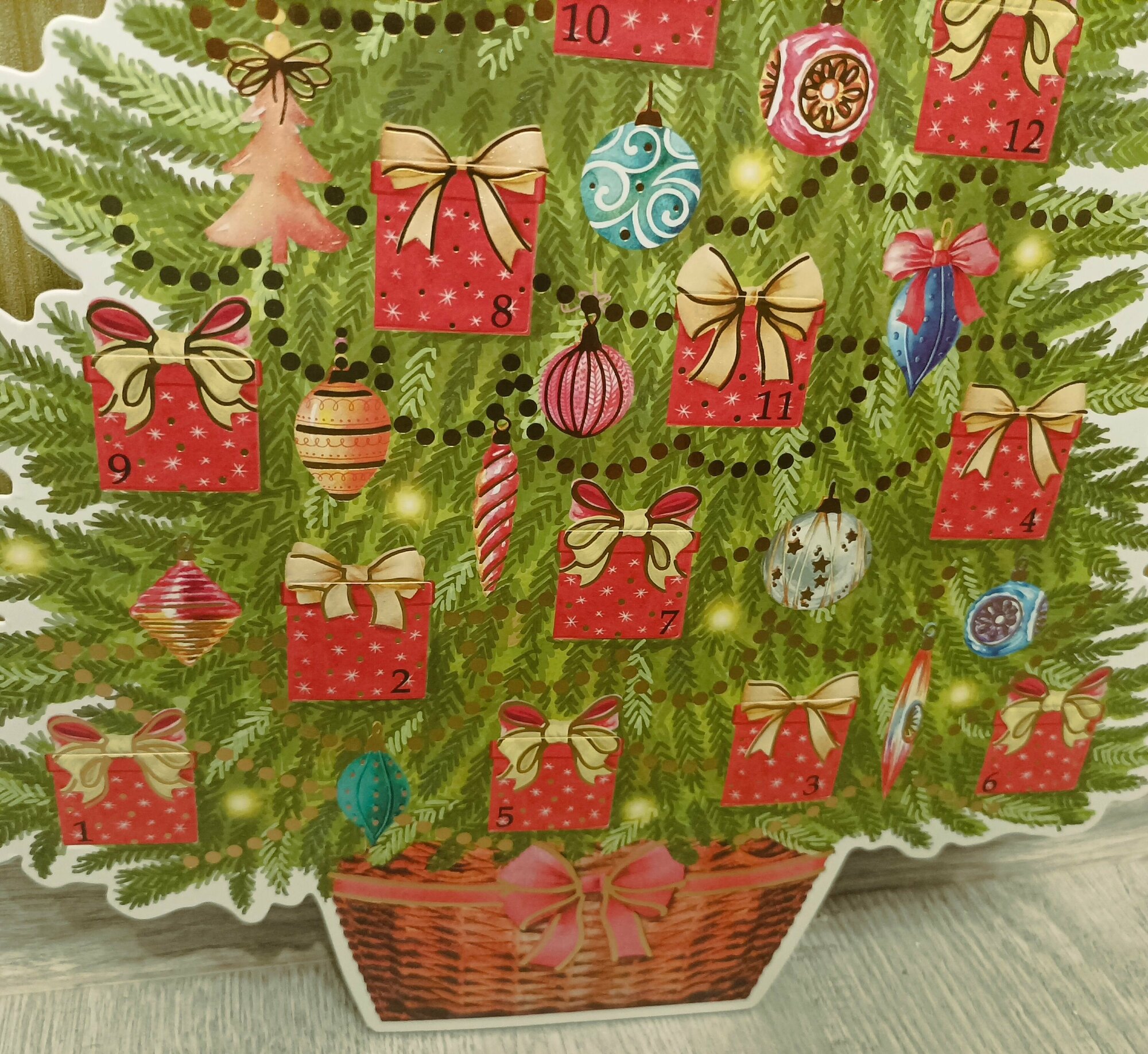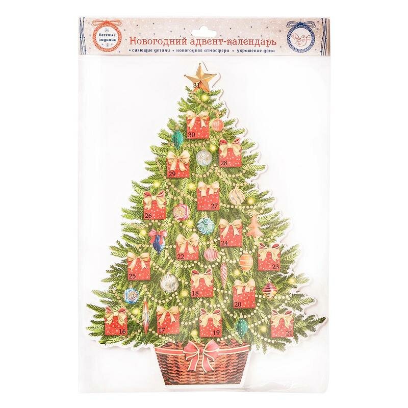 Эта великолепная елка-адвент-календарь создаст новогоднее настроение и поможет весело провести время в ожидании праздника. Ежедневно открывайте окошко с соответствующей датой. Выполняйте по одному новогоднему заданию в течение декабря. Всего в адвент-календаре можно найти 31 окошко с заданиями, расположенные на обеих сторонах ёлки. В оформлении используется золотое тиснение. Размер календаря: 34,5 х 49,5 х 0,4 см, он удобно раскрывается в нижней части и стоит самостоятельно. Елка-календарь ожидания Нового года не только интересное развлечение для всей семьи, но и яркое дополнение новогоднего интерьера.