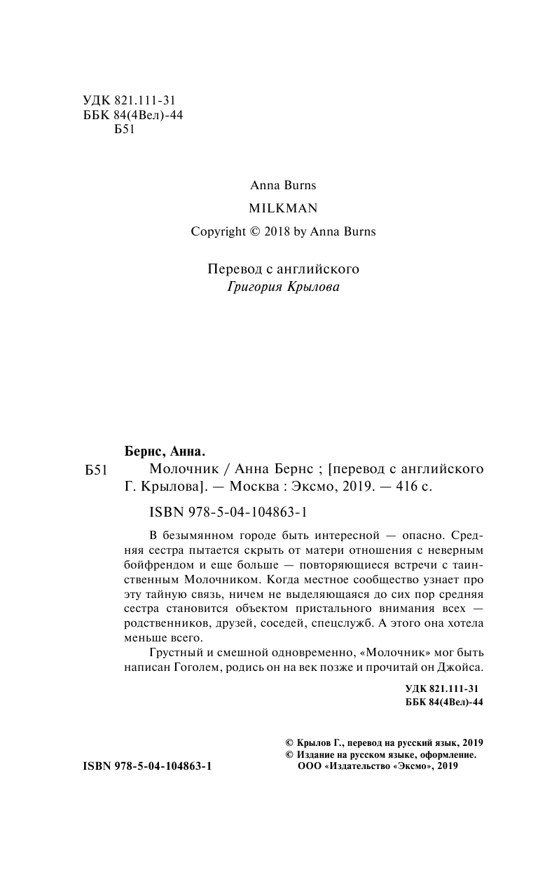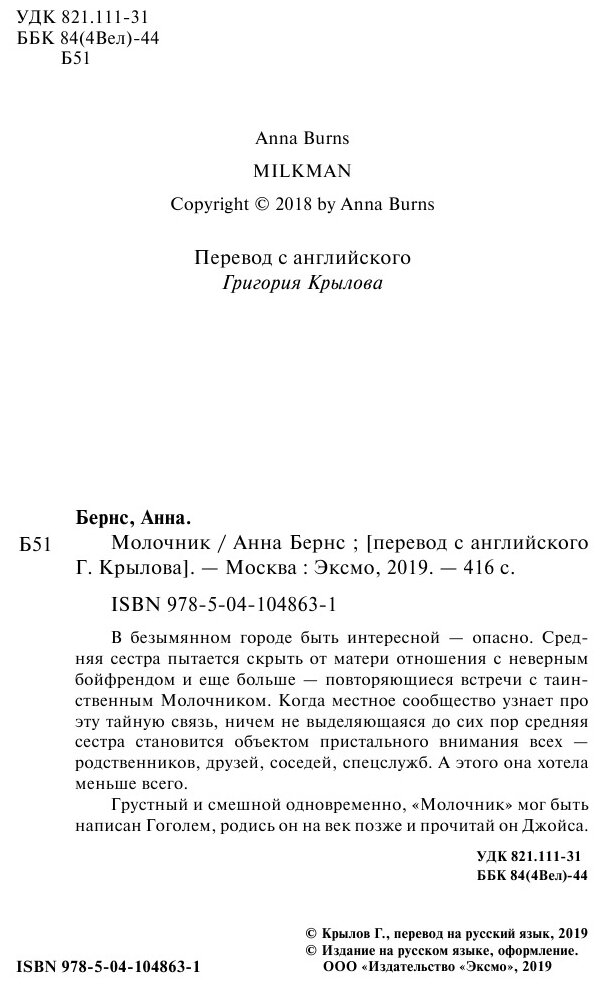 Книга: Молочник (Анна Бернс); Эксмо, Редакция 1, 2020