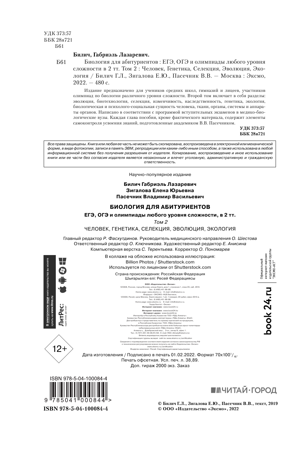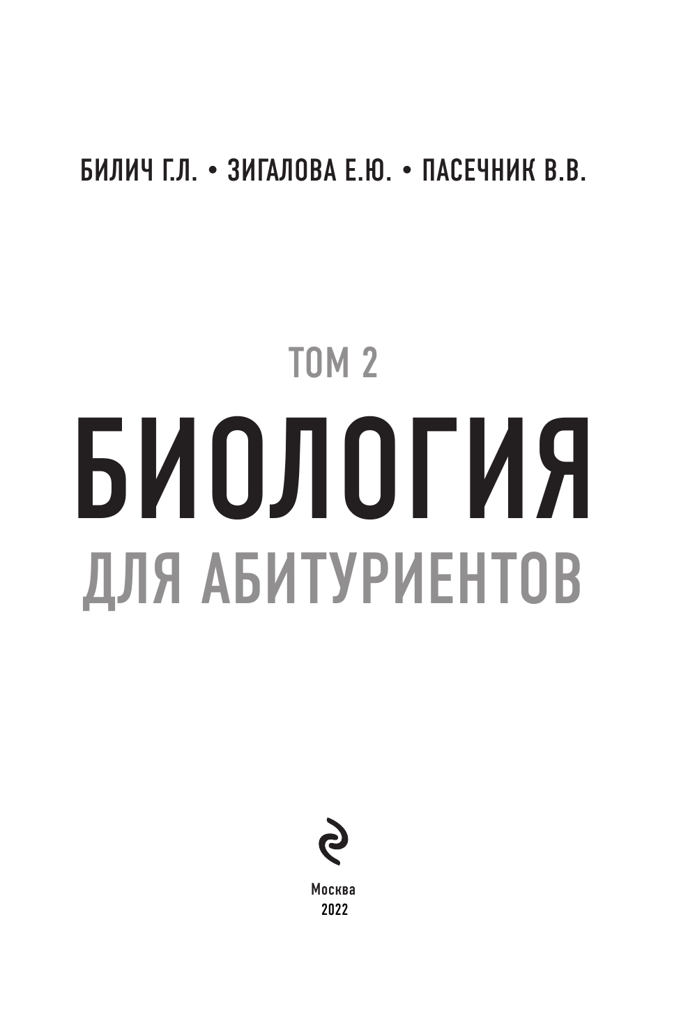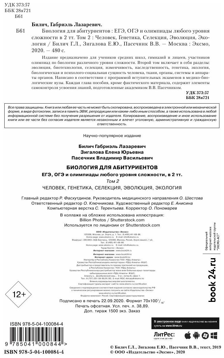 Биология для абитуриентов: ЕГЭ ОГЭ и Олимпиады любого уровня сложности. В 2-х томах. Том 2 (Билич Габриэль Лазаревич, Пасечник Владимир Васильевич, Зигалова Елена Юрьевна); ООО "Издательство "Эксмо", 2020