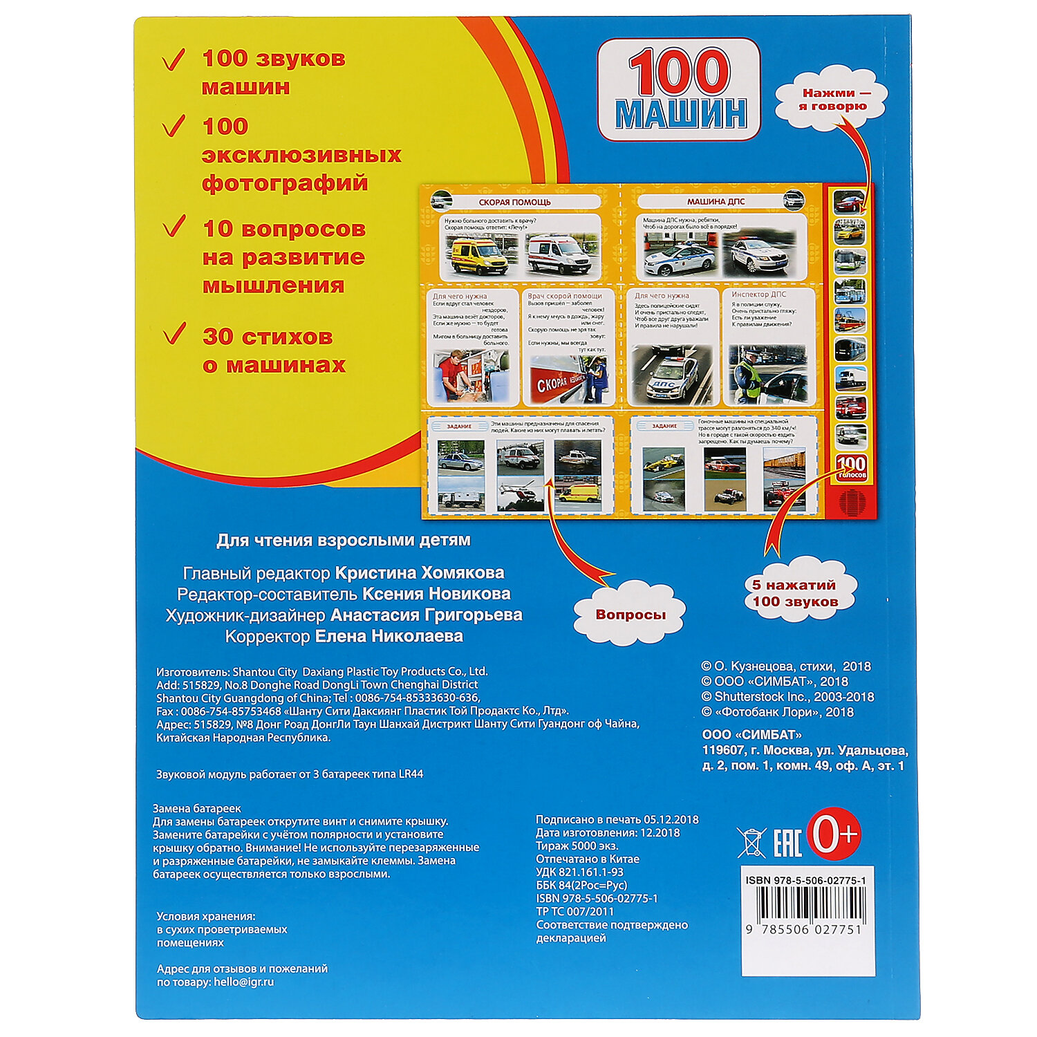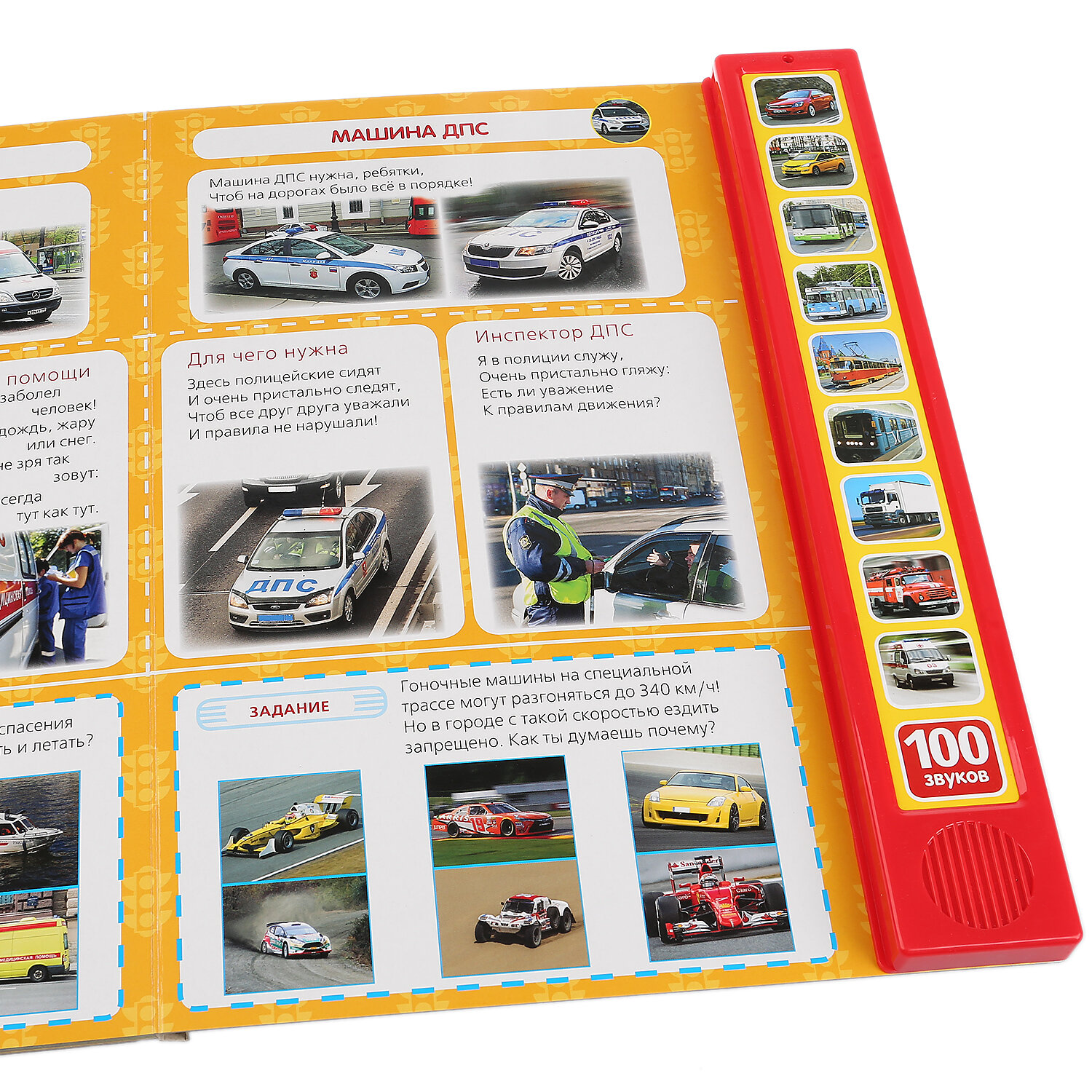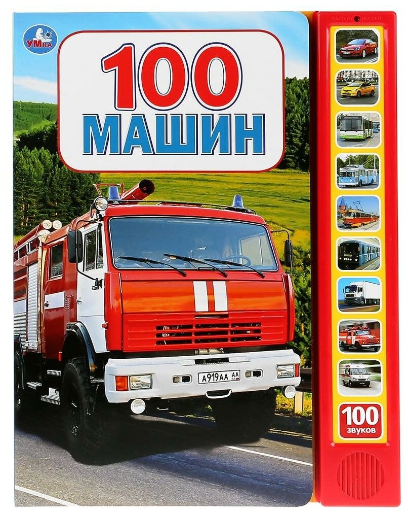 Встречайте книгу, от которой юные автолюбители придут в восторг – яркую и красочную энциклопедию-сборник «100 Машин»! Узнайте всё о машинах, нажимайте на звуковые кнопочки и слушайте звуки транспорта! Такое увлекательное и весёлое чтение приведёт ребёнка в восторг.Развивающая музыкальная книжка «100 Машин» ТМ «УМка» - это сразу 5 функций-преимуществ в 1-м ярком сборнике:- Специально отобранные лучшие реалистичные яркие, крупные, красочные иллюстрации машин;- 100 Наименований автомобилей и специальной техники!- Учимся: изучаем мир машин вместе с ребёнком;- Развиваем моторику: нажимаем на кнопки на обложке книги – и слушаем аудио сопровождение текста!- Книжка с «изюминкой» сразу привлечёт внимание: 10 звуковых кнопок на обложке при нажатии порадуют вас и ребёнка 100 звуками машин!Читая такую замечательную музыкальную книгу ТМ «УМка», ребёнок будет развивать:- Моторику;- Внимание;- Логику и мышление;- Зрение и слух;- А ещё книга научит ребёнка разбираться в автотранспорте самым эффективным образом – в формате весёлой игры!Формат книги: 233 * 302 мм.Объём: 10 стр.Работает от 3-х батареек LR44 (часовые).Для детей с рождения.
