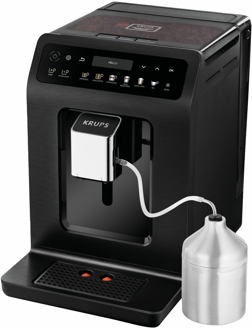 Автоматическая кофемашина Krups отличается потребляемой мощностью 1450 Вт. Управление работой устройства осуществляется на сенсорном дисплее с таймером. В приборе предусмотрены индикаторы отсутствия кофе, уровня воды, готовности к работе, режима и очистки от накипи. Модель предназначена для приготовления 6 разновидностей напитков: эспрессо, капучино, эспрессо-лунго, флэт-уайт, латте и латте-макиато.