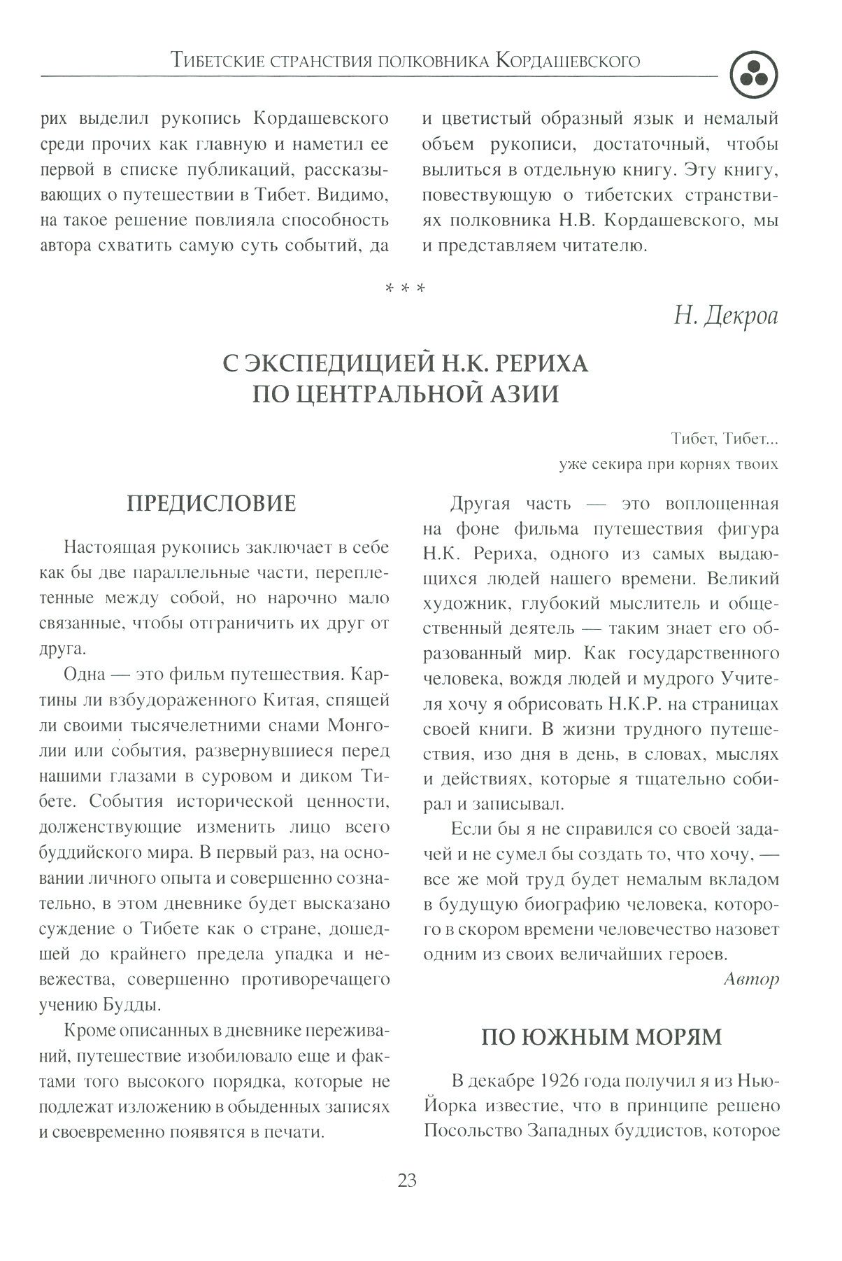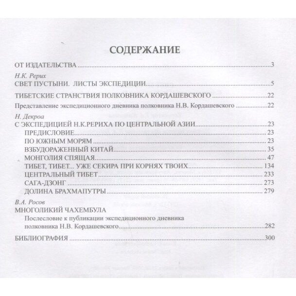 В настоящем сборнике читателю предлагается работа Н.К. Рериха под названием "Свет пустыни". Также читатель может познакомиться с экспедиционными дневниками Николая Викторовича Кордашевского (1877-1945), начальника конвоя. Бывший полковник русской армии, человек незаурядной судьбы, он был приглашен в состав экспедиции Н.К. Рерихом и принял в ней участие на монгольском и тибетском участках.