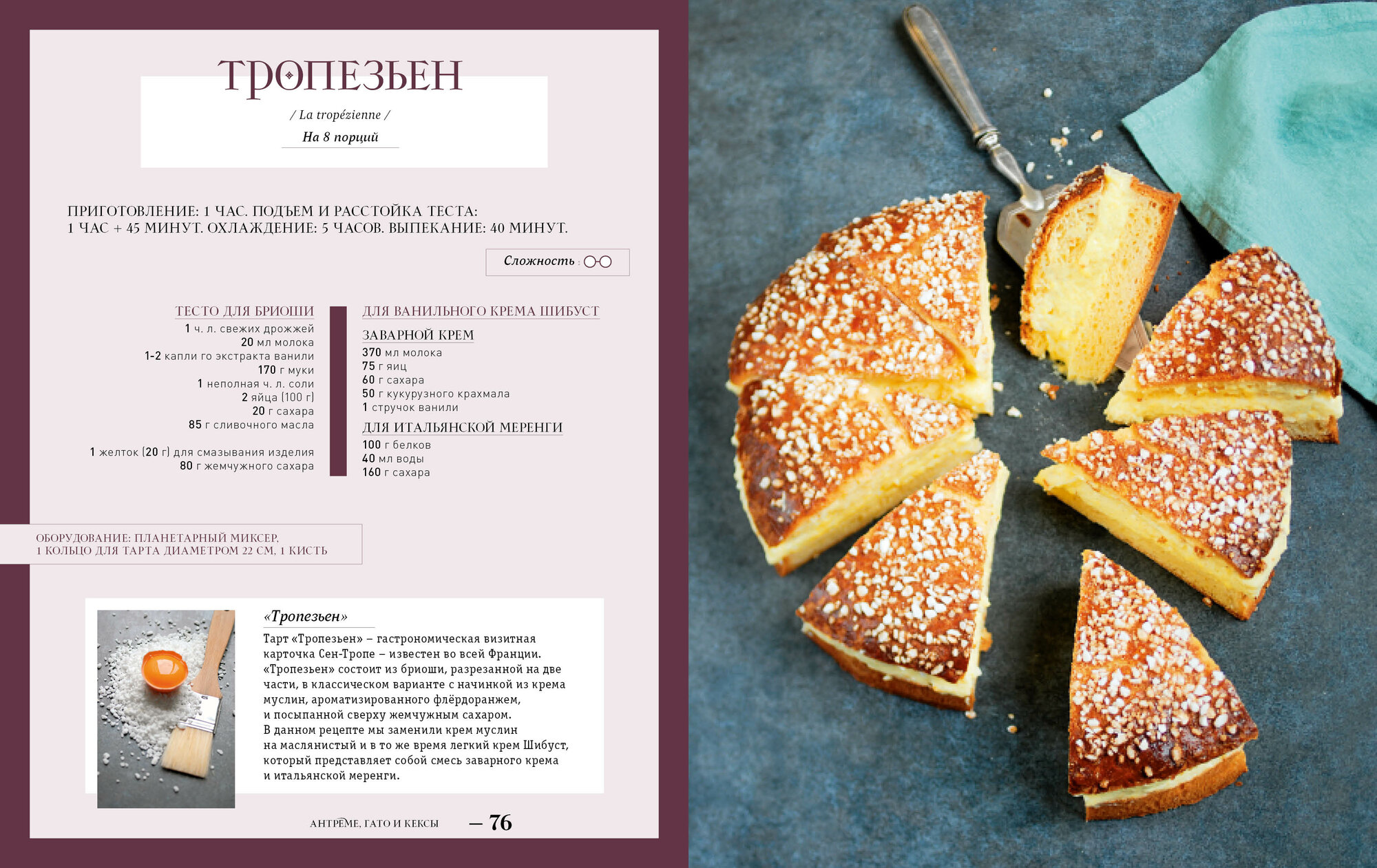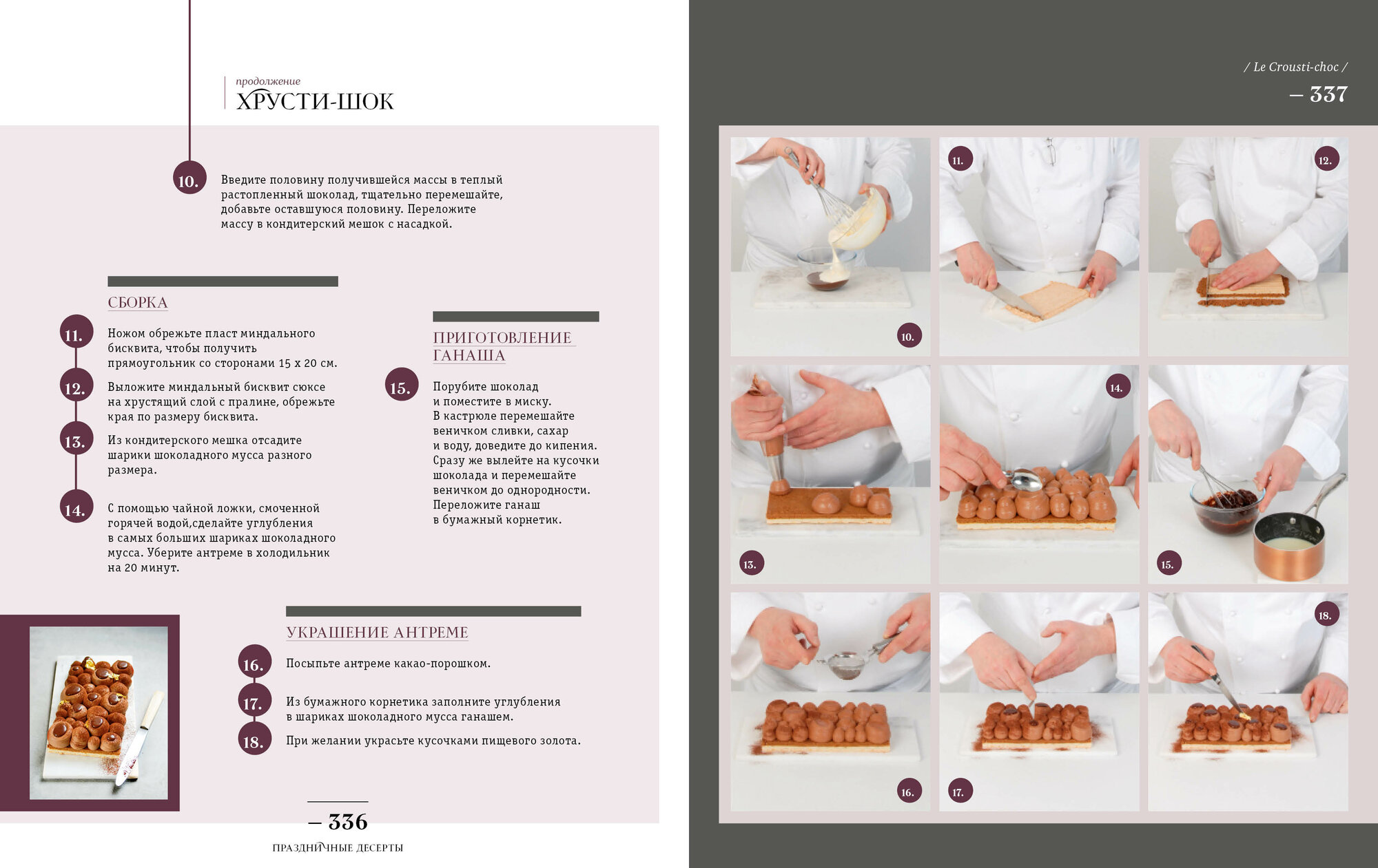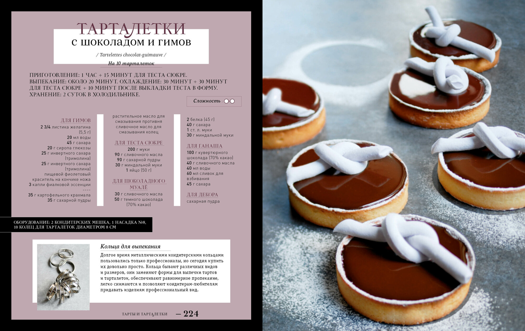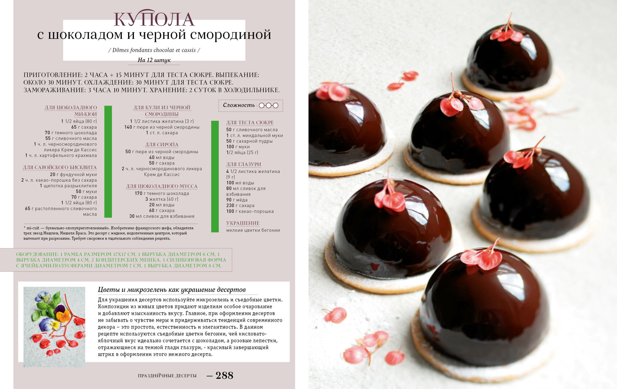 Разнообразие рецептов очень велико - от печенья и трюфелей до сложных антреме и муссовых пирожных - при этом для приготовления всех изделий вам понадобится минимум инвентаря (лопатки и спатулы, несколько колец и силиконовых форм, термометр).