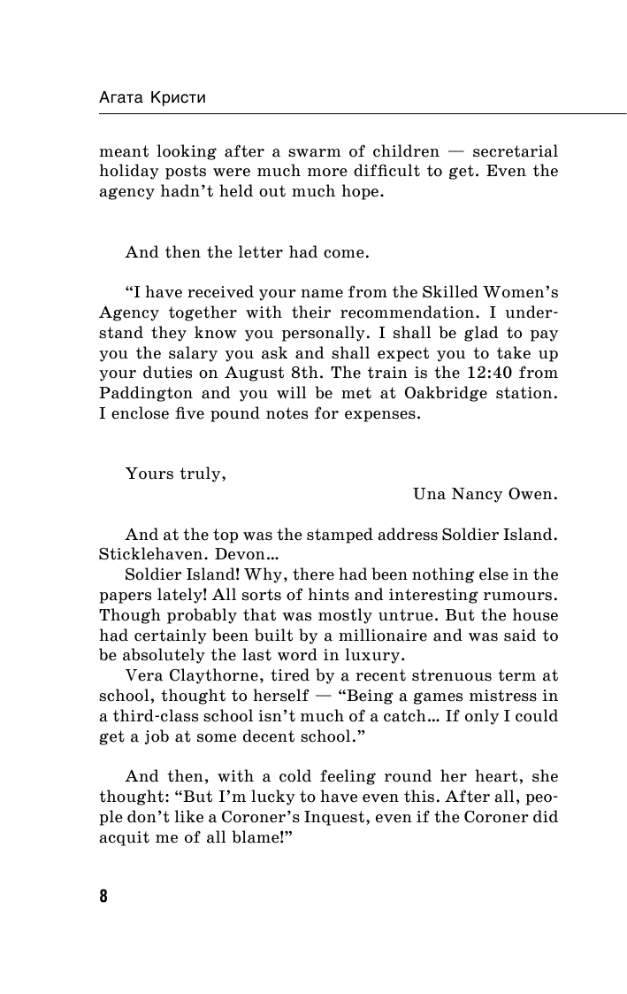 Десять никак не связанных между собой людей в особняке на уединенном острове... Кто вызвал их сюда таинственным приглашением? Зачем кто-то убивает их, одного за другим, самыми невероятными способами? Почему все происходящее так тесно переплетено с веселым детским стишком?