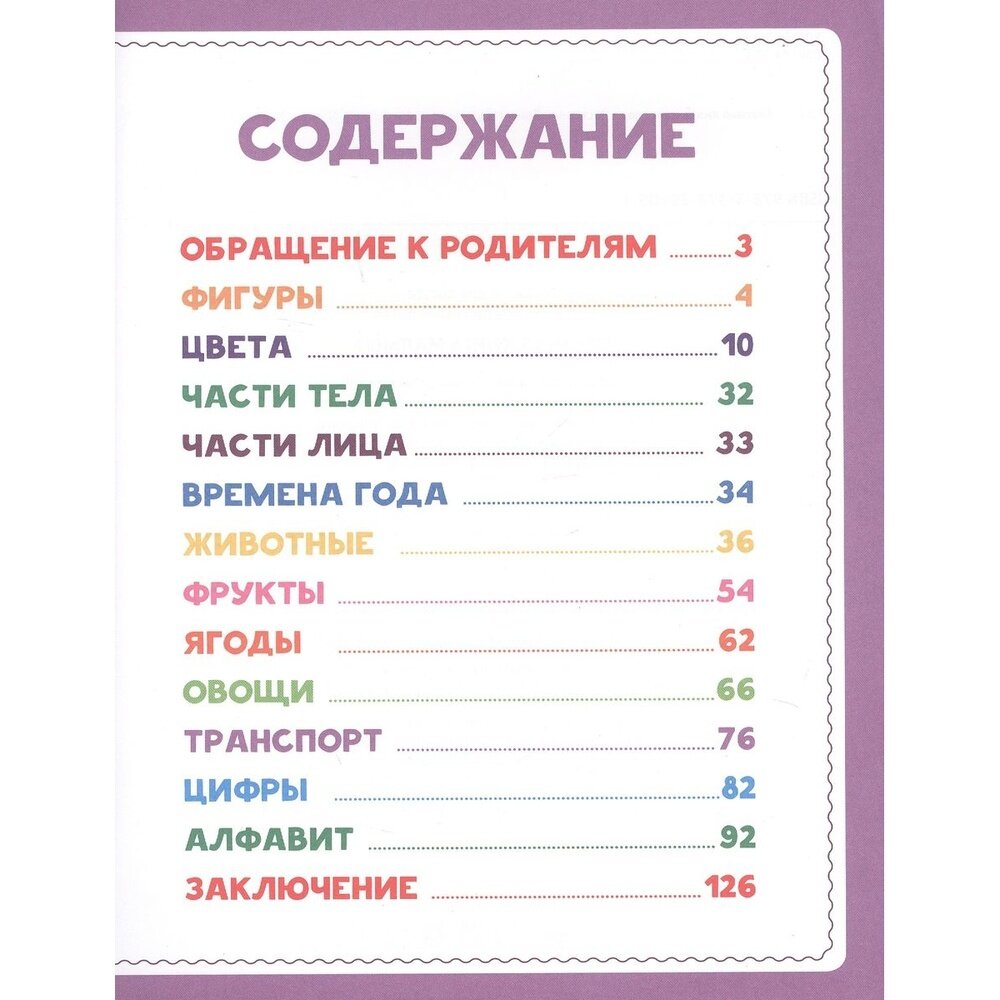 В этой книге малыш найдёт много интересной информации об окружающем мире. Сборник познакомит ребёнка с геометрическими фигурами, цветами, различными животными, фруктами и овощами, видами транспорта, цифрами и буквами алфавита, а также научит узнавать части лица и тела. Яркие фотографии сделают обучение увлекательным и доступным.
