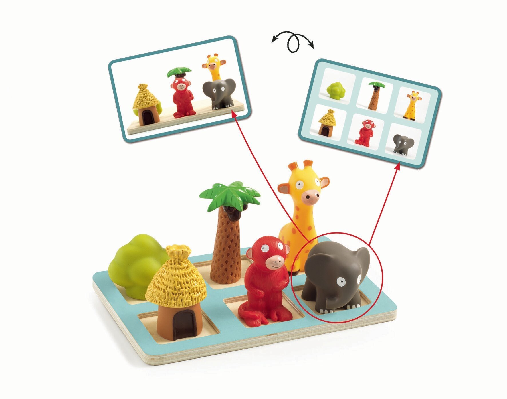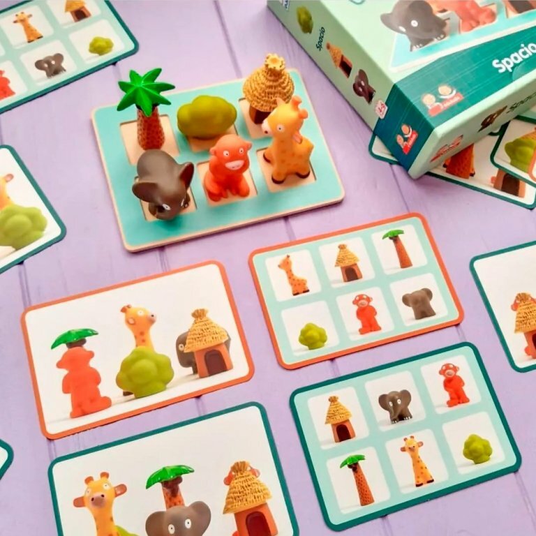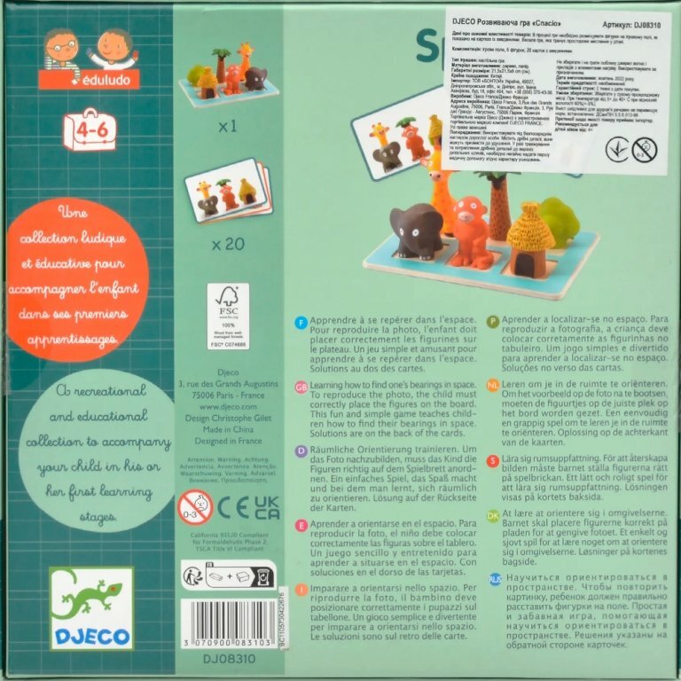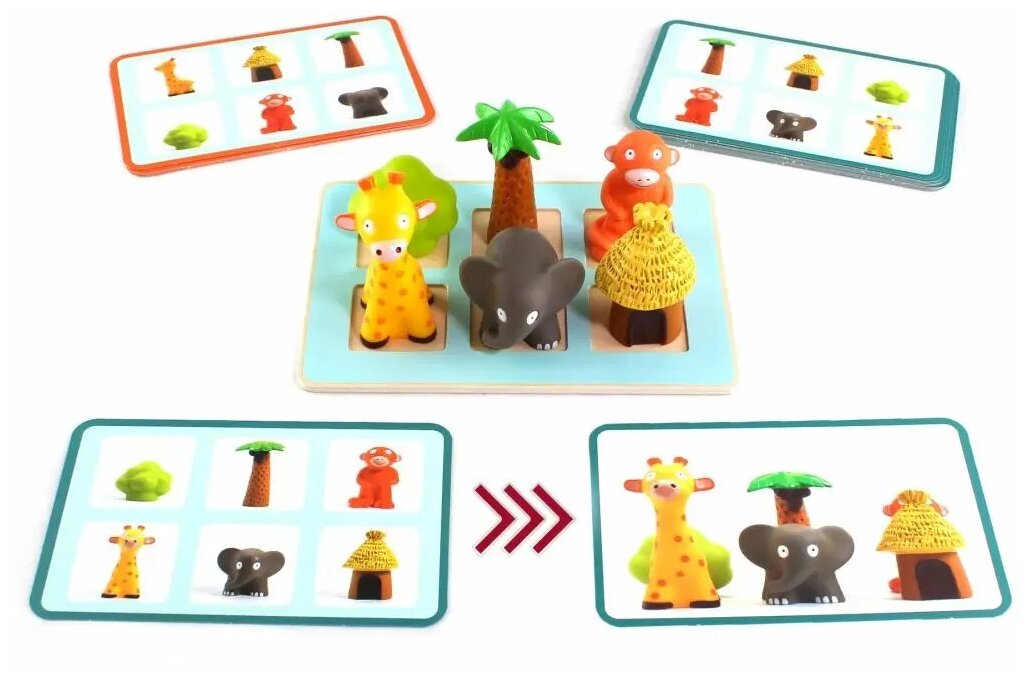 от Djeco заинтересует детей 4-6 лет. Ребенку предлагается разместить фигурки животных так, как изображено на фотокарточках. Где же должен стоять жираф, впереди или позади слона?