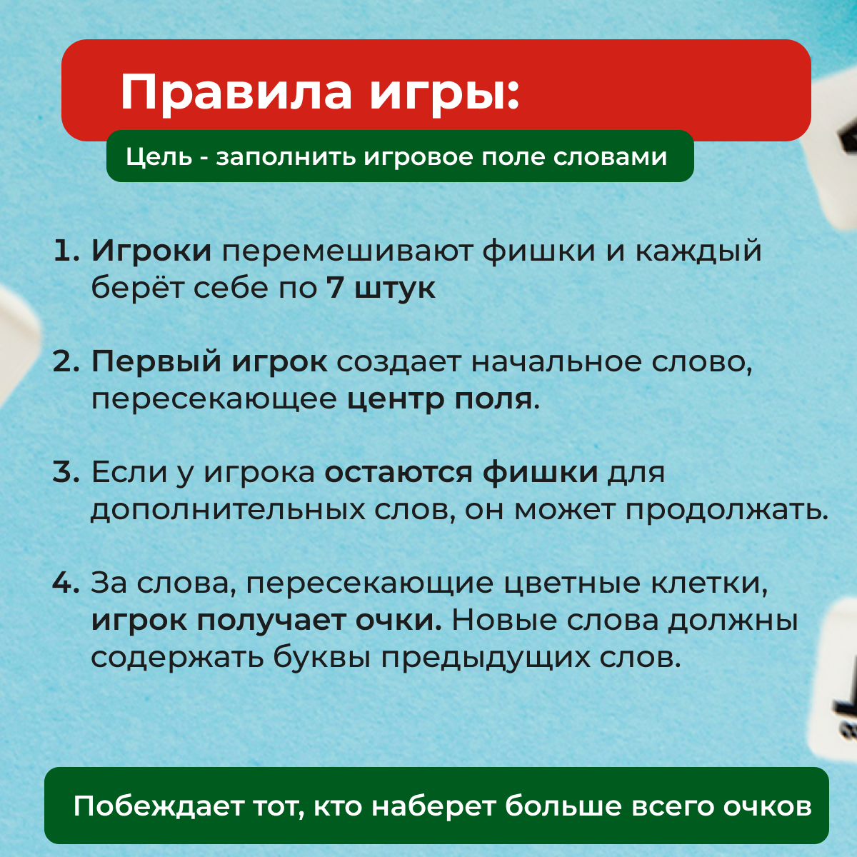Перед игрой каждый из игроков получает определенное количество фишек. Требуется по очереди составлять из них слова на игровом поле (одна клетка – одна буква). За один ход можно составить сколько угодно слов из имеющихся на руках фишек. Главное условие – новые слова составляются на базе уже существующих. Причем для составления новых слов можно использовать как отдельные буквы, так и несколько букв, и даже целые старые слова. Выигрывает тот, кто наберет максимальное количество очков, составив больше всего слов.Смотри также характеристики.