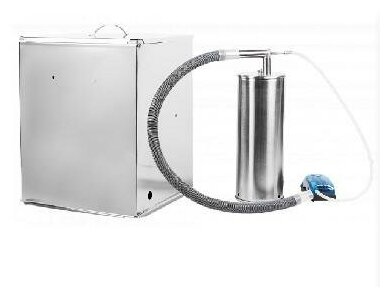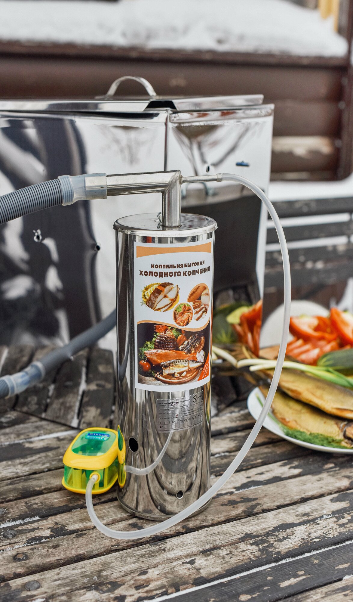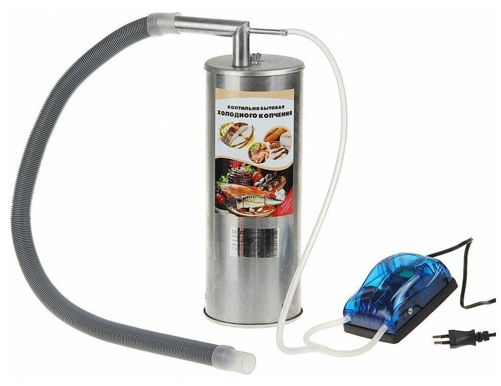Коптильня холодного копчения — это компактный дымогенератор, который дополнительно оснащен компрессором принудительной подачи дыма. Дым подается в специальную камеру. Коптильную камеру можно изготовить самостоятельно или использовать уже готовую емкость с простым дымоходом. Компрессор коптильни оборудован регулятором мощности подачи воздуха, поэтому вы сможете сами контролировать весь процесс.