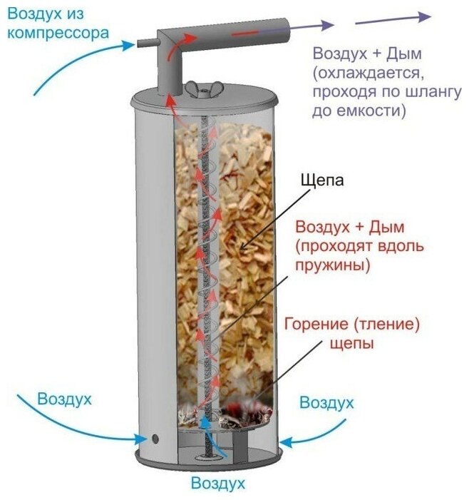Преимущества:- Забор дыма осуществляется сверху. Так как дым проходит вдоль пружины через щепу, а затем через длинный гофрированный шланг, он постепенно охлаждается, очищается от влаги и вредных примесей.