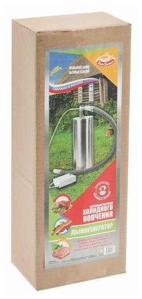 | Комплектация | Корпус дымогенератора; колосник; опорный стержень; пружина; барашек; крышка корпуса дымогенератора; труба для выхода дыма; труба для подачи воздуха; силиконовый шланг (с пластиковым тройником в сборе); воздушный компрессор; гофрированный шланг для подачи дыма в емкость для копчения |