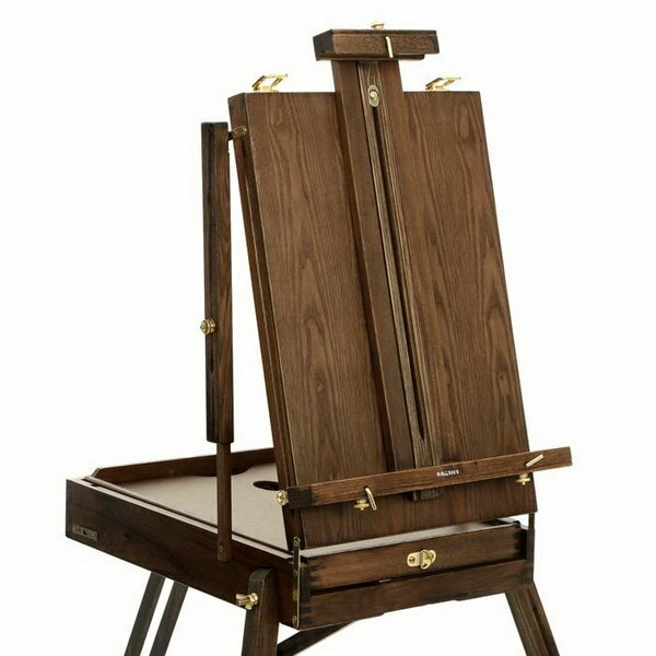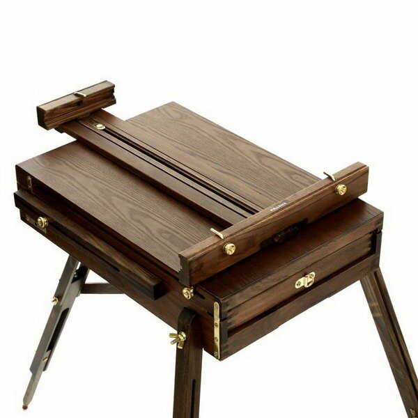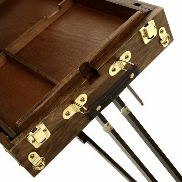 Крепления и фурнитура этюдника выполнены из устойчивого к коррозии металлического сплава красивого золотистого цвета. Телескопические ножки этюдного ящика позволяют изменять его высоту для работы сидя или стоя. При желании, ножки можно сложить, чтобы использовать приспособление в качестве настольного мольберта. Полка для холста также регулируется по высоте. Кроме того, конструкция этюдника позволяет наклонять холст на себя или от себя, по аналогии с наклонной штангой студийных мольбертов.