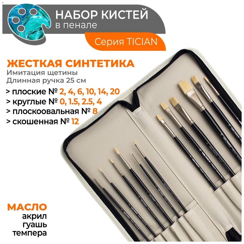 Модель: Набор круглых и плоских кистей Тициан в пенале 12 шт.
