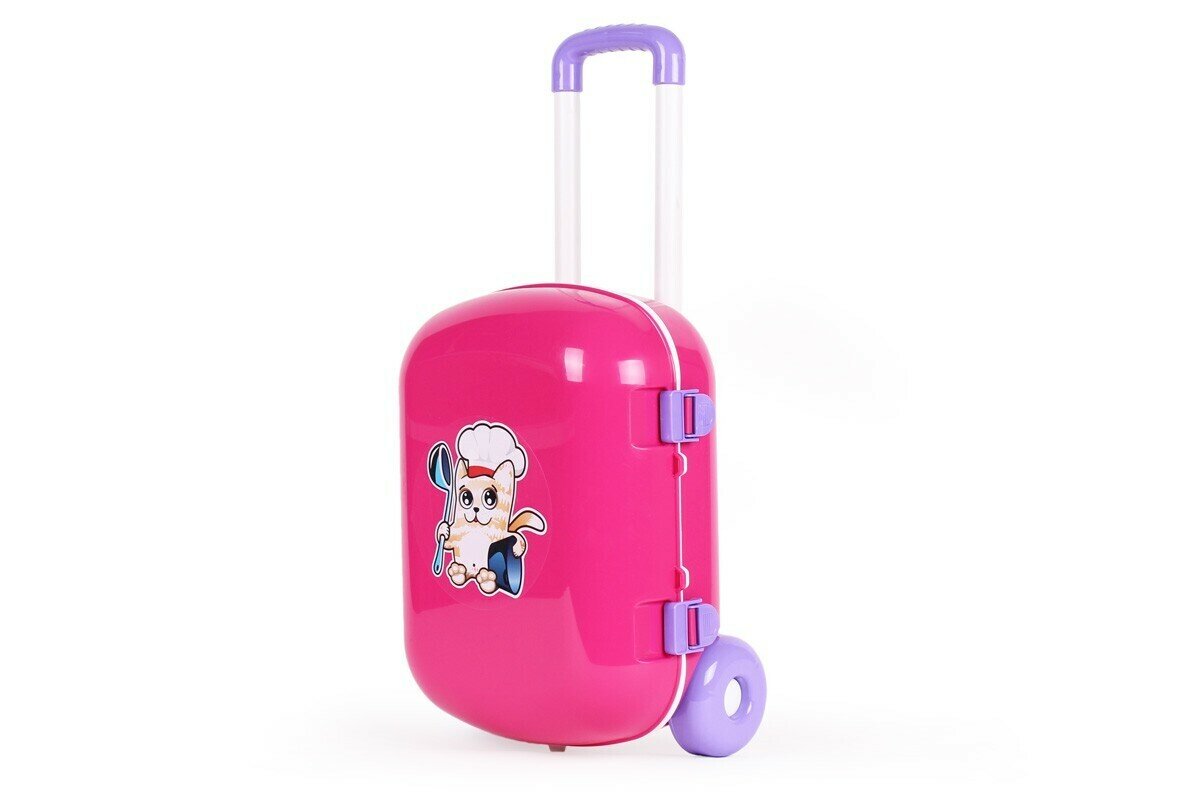 Игрушку «Кухня с набором посуды» выгодно отличает ее дизайн: игрушечная кухня с посудой продается в ярком розовом чемодане. Такой вариант игрушки «два в одном» действительно интересен для детей. На малышей ожидают приятные волнения по поводу того, что же внутри чемодана, интрига в процессе его распаковки и, на конец, долгожданная награда — захватывающие игры с кухней, посудой и чемоданом.Чемодан имеет большие крепкие колеса, удобную ручку, что регулируется и надежные защелки Это позволяет ребенку свободно перевозить кухонный набор в ней.Открытая крышка чемодана фиксируется в нескольких положениях, а на ее внутренней стороне есть интересная наклейка, имитирующая кухонную полку. Игрушка «Кухня с набором посуды» выполнена в розовой цветовой гамме, что понравится юным поварятам и они легко «приготовят» свои кулинарные шедевры даже во время путешествий! Прекрасный подарок для девочки на 8 марта, Новый год, день рождения.Размер игрушки: 34.5х26х16 см; Для детей от 3-лет; Развивает моторику, кругозор, воображение, логическое и пространственное мышление;✔ В наборе: чемодан, столешница кухонная, кран, большая кастрюля с крышкой, глубокая тарелка - 2 шт, ложка 2 шт.