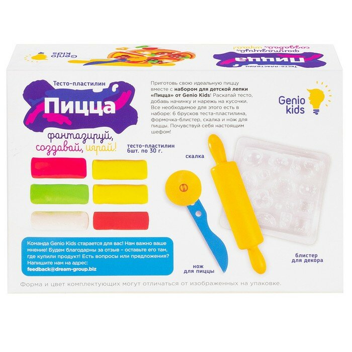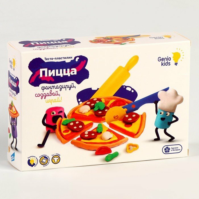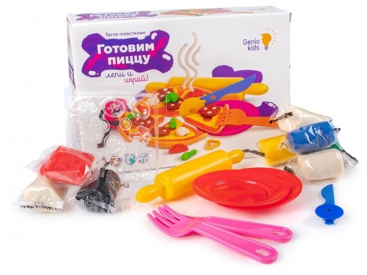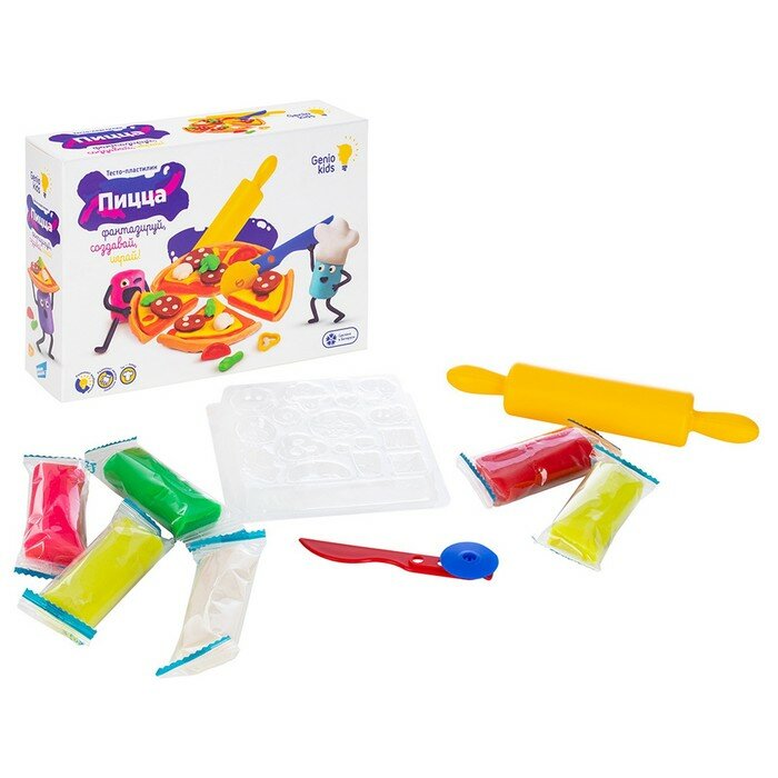 | Комплектация | тесто-пластилин - 8 шт по 50 гр, блюдце – 2 шт, вилка – 2шт, скалка – 1 шт, нож для пиццы - 1 шт, блистерная форма для декора - 1 шт. |