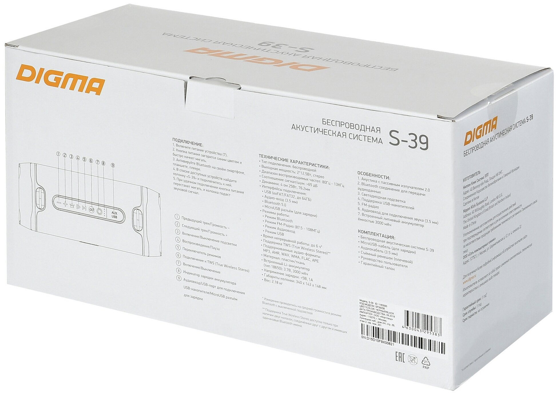 Digma S-39 представляет собой стильную функциональную беспроводную акустику, которая обеспечивает качественный насыщенный звук и работает от собственного аккумулятора. Она позволит наслаждаться любимой музыкой более 6 часов без подзарядки, а в качестве источника сигнала можно использовать смартфон или планшет.