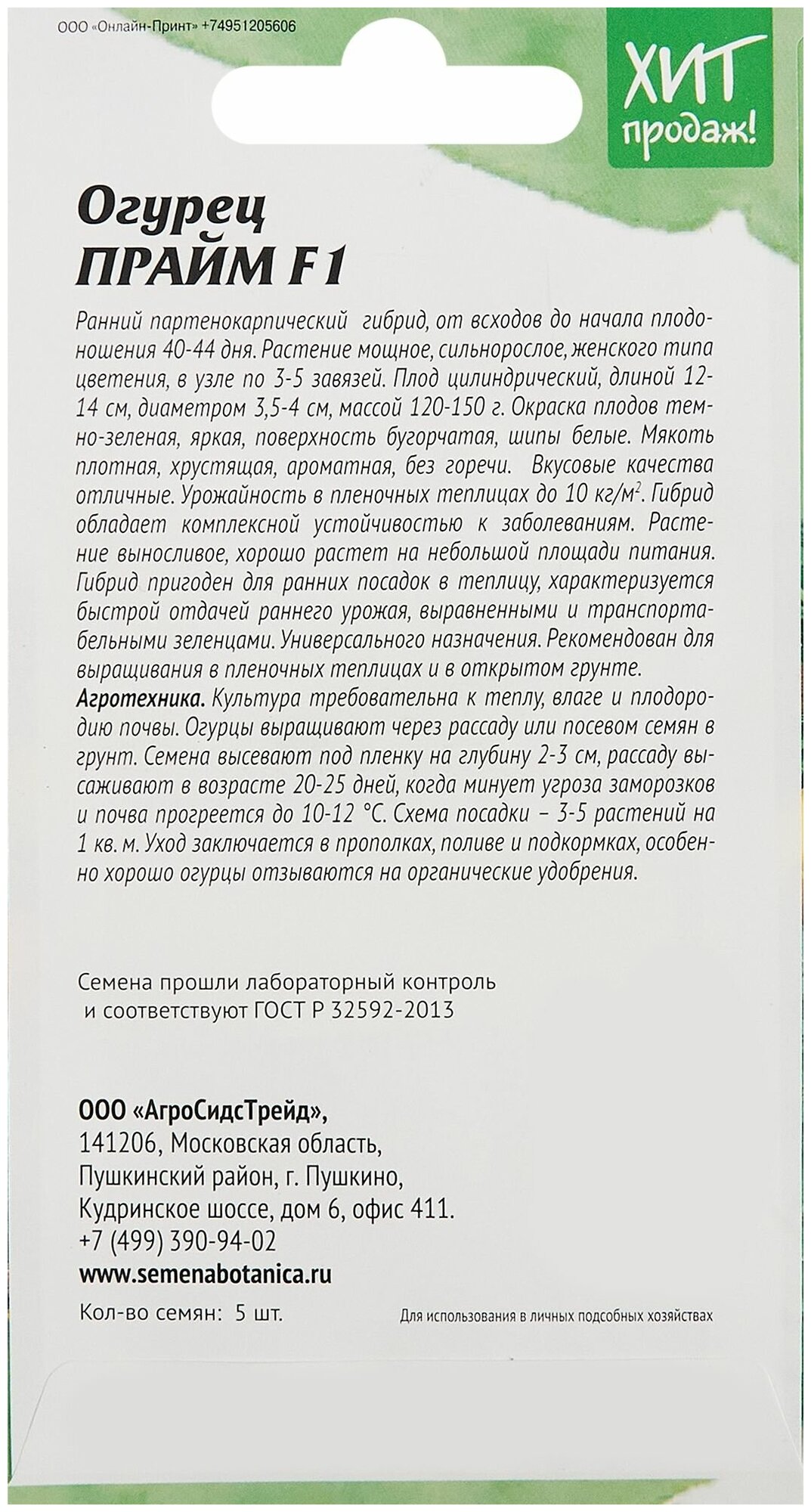 Огурец АгроСидсТрейд Прайм F1 5 шт