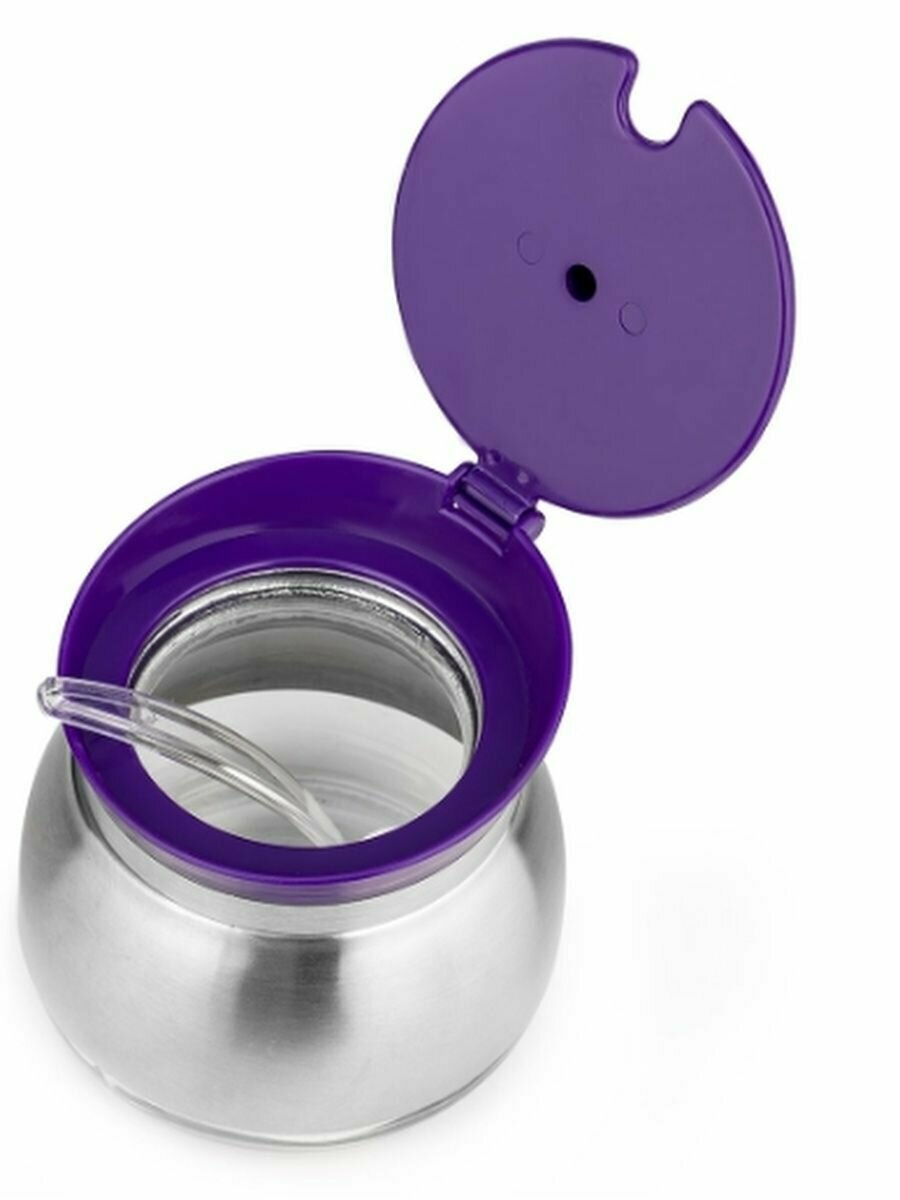 Зачем хранить сахар в рваном пакете или заводской бумажной упаковке, если есть сахарница LARA с откидной крышкой и пластиковой ложечкой в комплекте. Благодаря практичному дизайну и необычной форме она станет заметным акцентом в оформлении Вашего стола. Для производства были подобраны экологичные и безопасные материалы. Чаша выполнена из толстого прозрачного стекла с декоративной защитной накладкой из высококачественной нержавеющей стали с матовой отделкой. Крышка из пластика фиолетового цвета сохранит содержимое. Лёгкий уход обеспечивает разборная конструкция, которую можно промыть под краном или воспользоваться посудомоечной машиной. Характеристики Объем 0,3 л Материал Нержавеющая сталь, Пластик ABS, Стекло Мытье В посудомоечной машине только части из стекла Особенности Ложка в комплекте