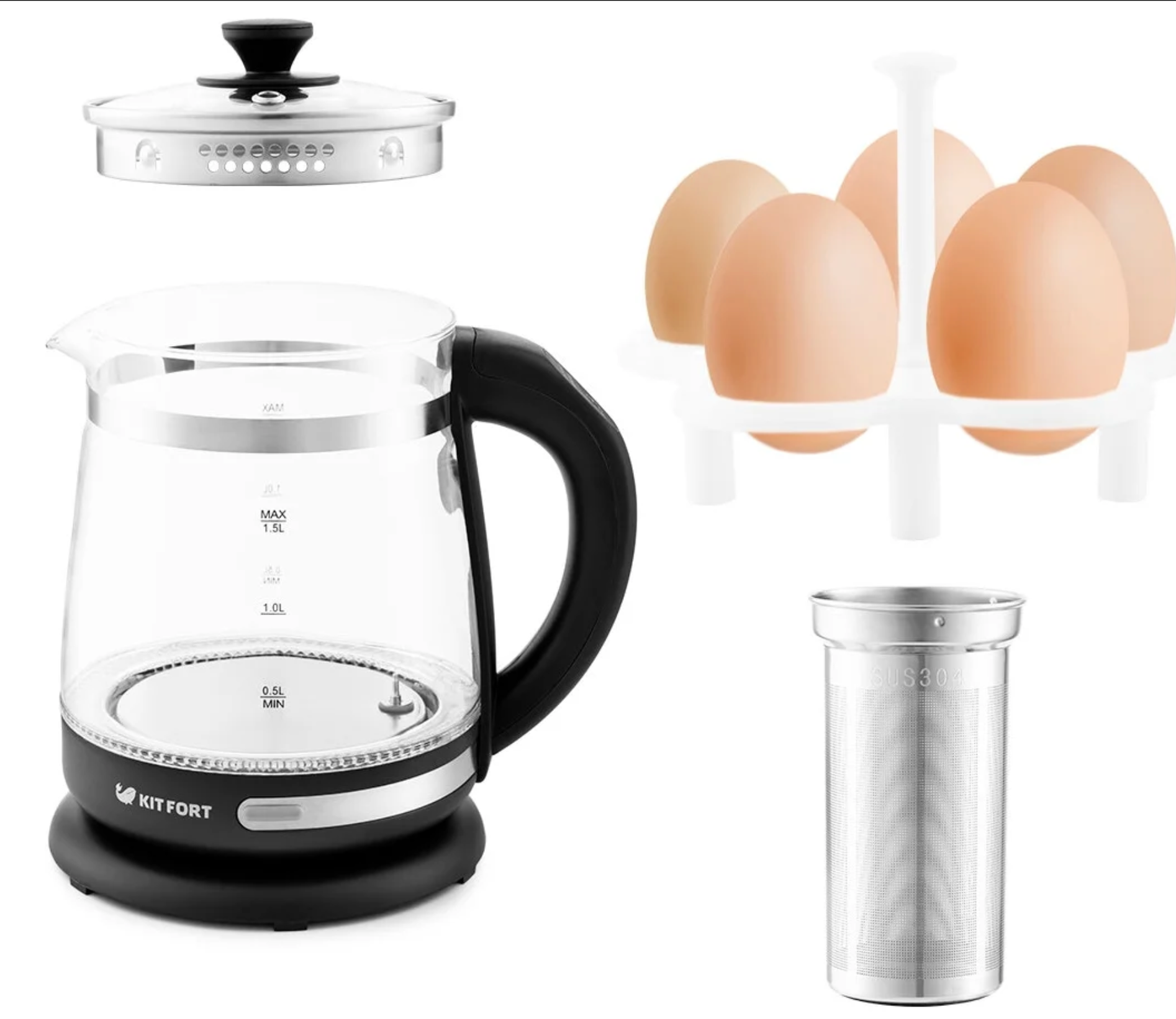 | Дополнительно * | Блокировка включения без воды, Специальная подставка для варки 5 яиц (яйца варятся прямо в чайнике), Специальный фильтр для заваривания чая |