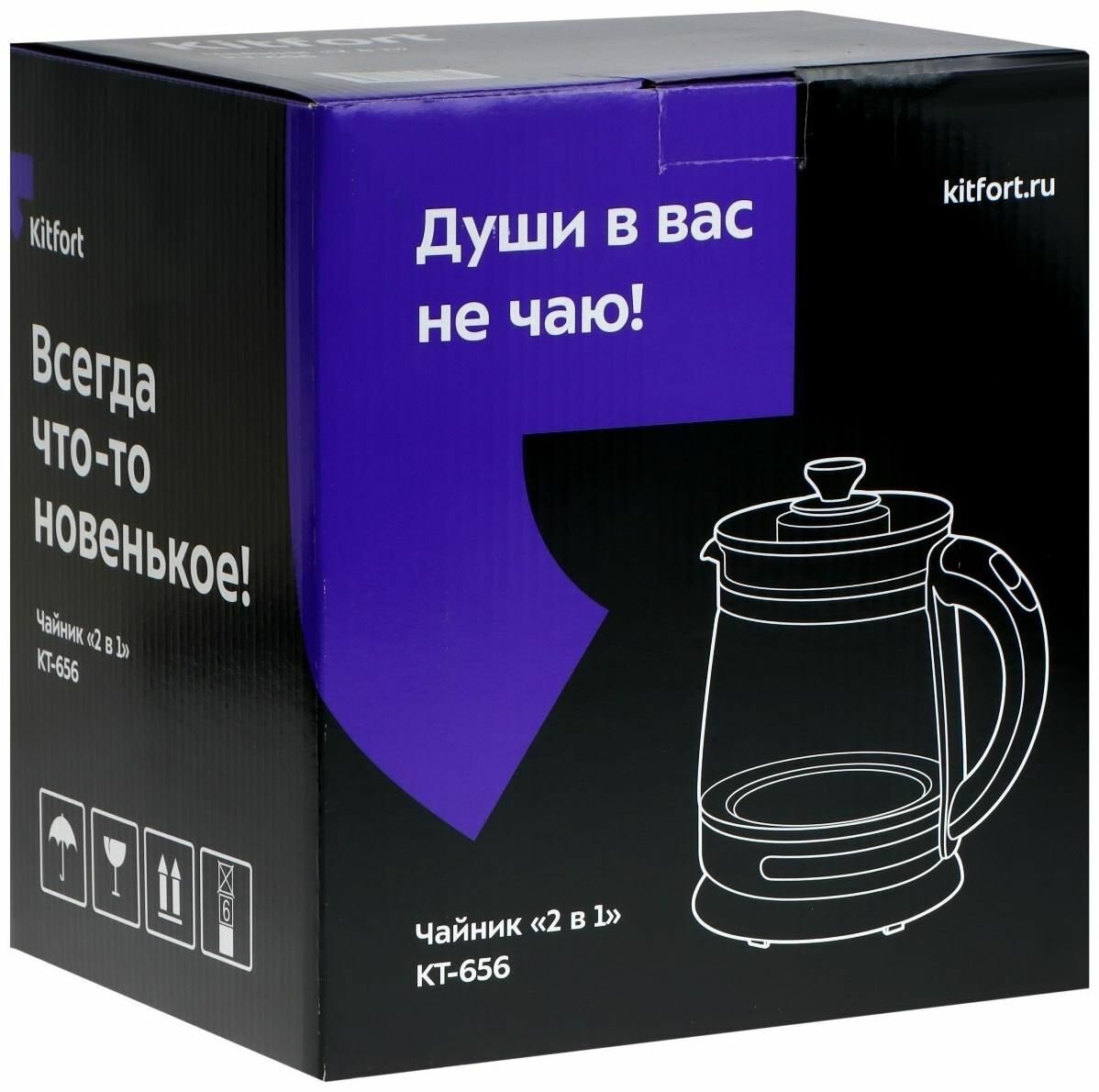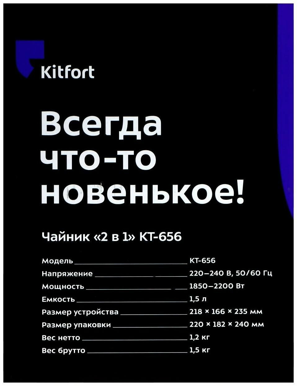 | Прочие особенности и свойства | Чайник «2 в 1» Kitfort KT-656 с электронным терморегулятором позволит не только вскипятить воду, но и нагреть ее до температуры 40, 70, 80 и 90 градусов, что очень удобно для заваривания различных сортов чая, кофе или для приготовления детского питания |