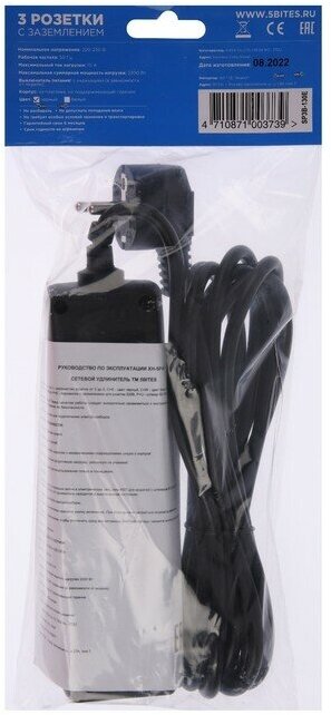| Дополнительно * | 3 розетки EURO / RUS, светодиодный выключатель, 220В/10А, мощность 2,2 кВт, корпус огнеупорный пластик, цвет: черный, кабель 3 м. |