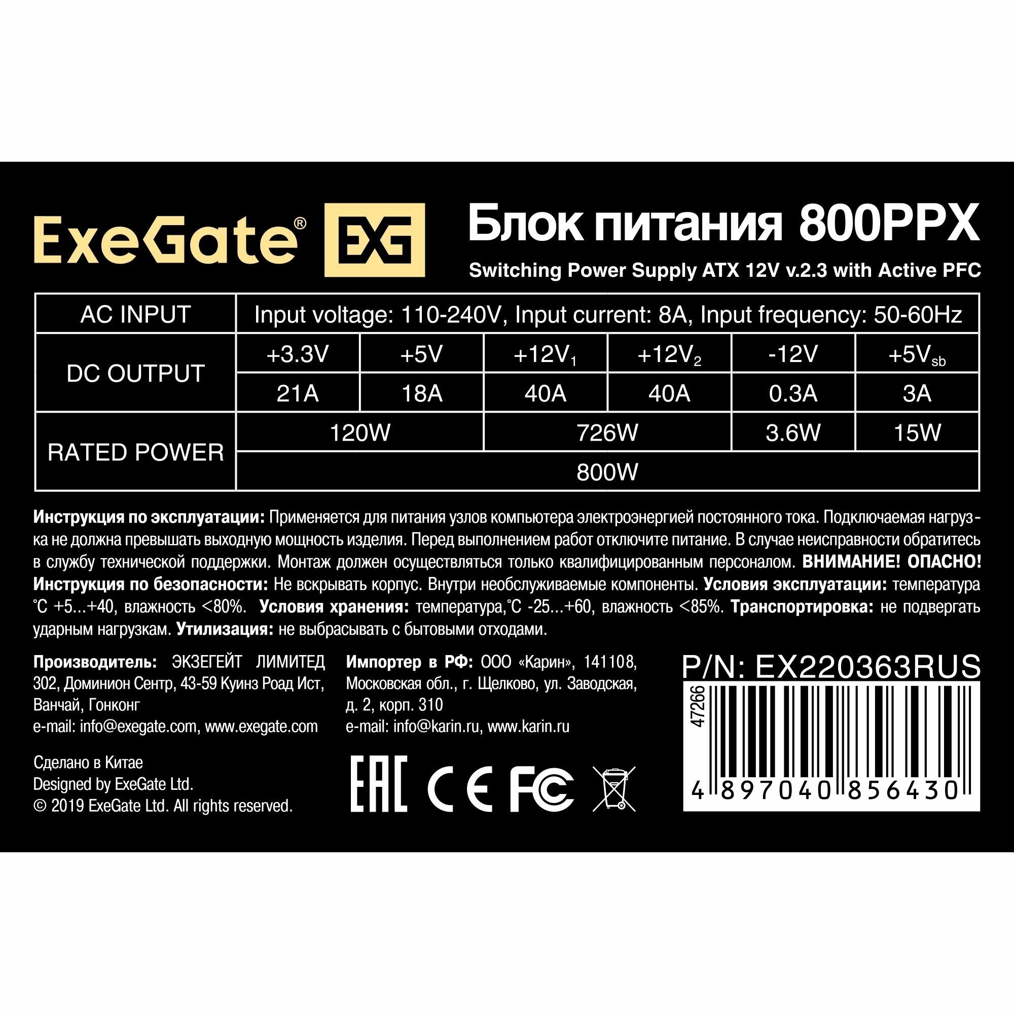 Блок питания ATX 800 Вт Exegate 800PPX EX220363RUS-S