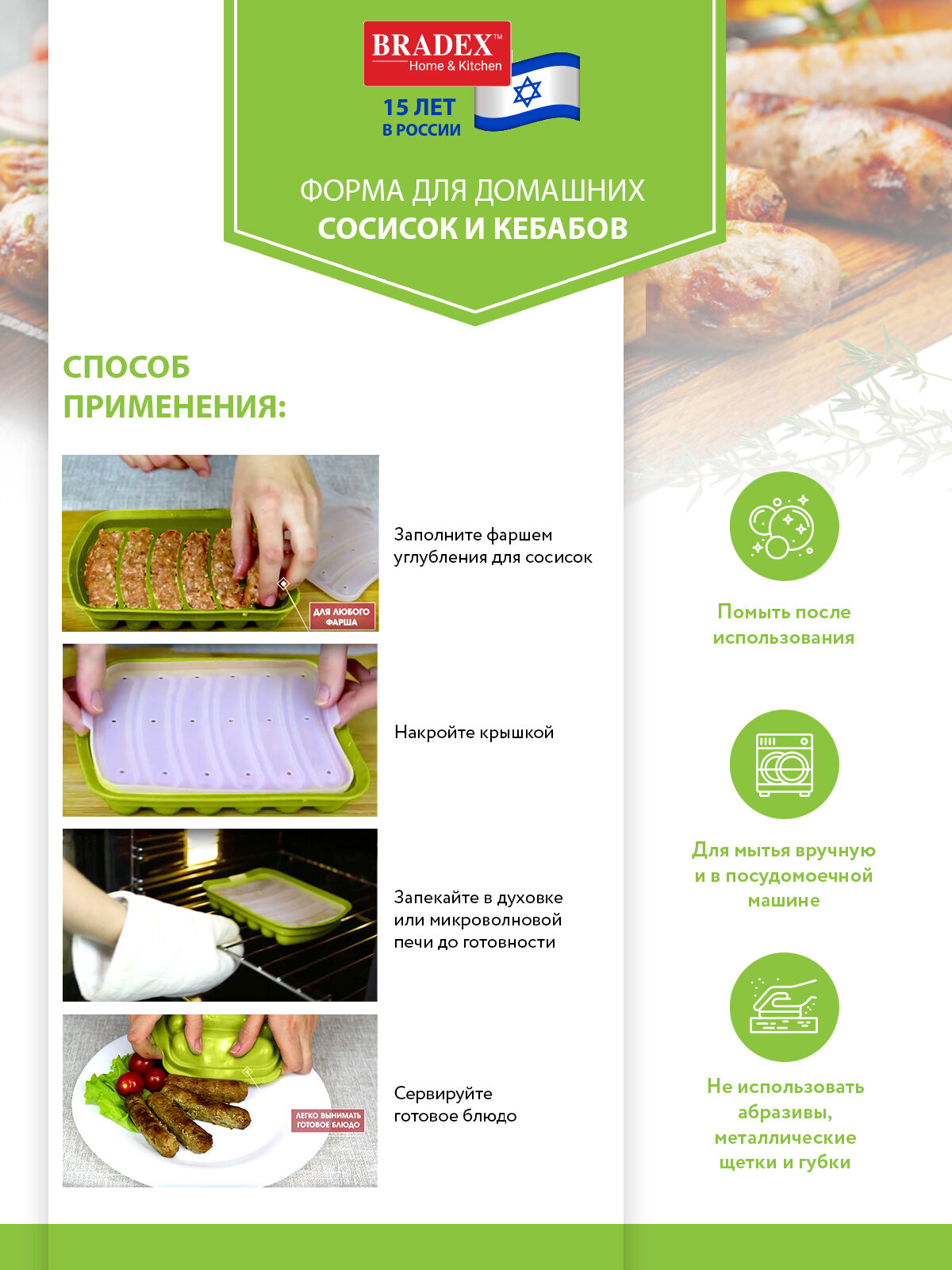 | Прочие особенности и свойства | Смажьте форму маслом. Приготовьте фарш. При желании добавьте специи, панировочные сухари, лук, яйцо, сыр или бекон. Заполните фаршем углубления для сосисок. Накройте крышкой. Запекайте в духовке или микроволновой печи до готовности. Готовые сосиски положите в форму и запекайте до готовности. Рекомендации по уходу:Помыть после использования. Можно мыть в посудомоечной машине. Не использовать абразивы, металлические щетки и губки. |