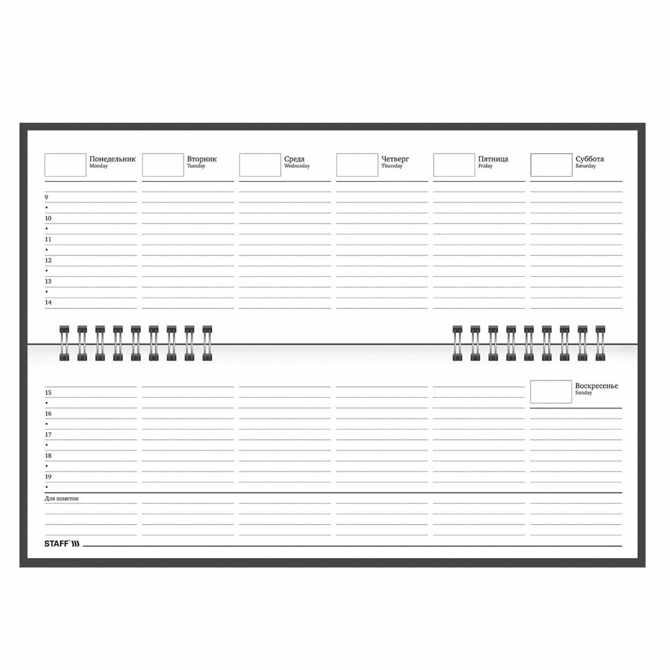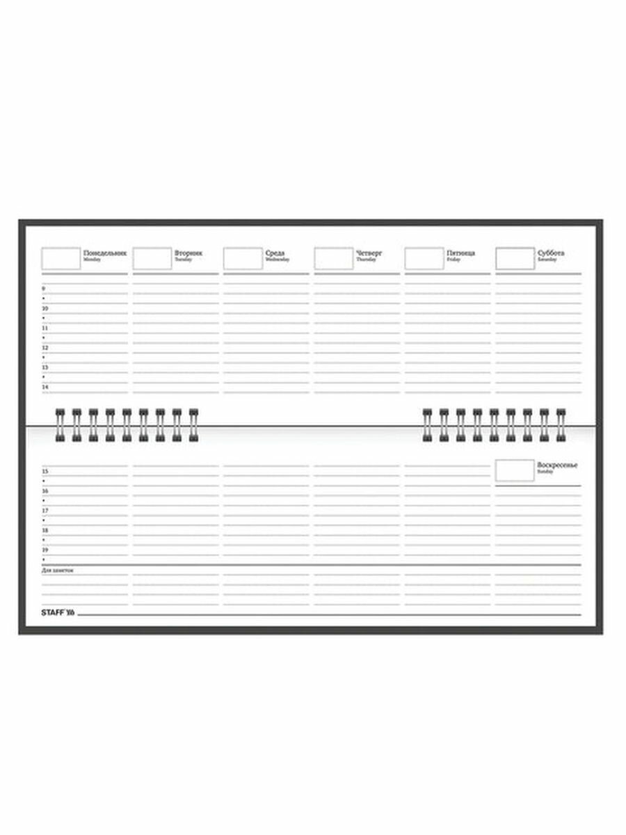 Недатированный планинг Staff 127056 предназначен для ведения записей. Отсутствие дат делает его уникальным товаром, которым можно начать пользоваться в любое время года. Выпускается в жестком переплете, покрытом бумвинилом.