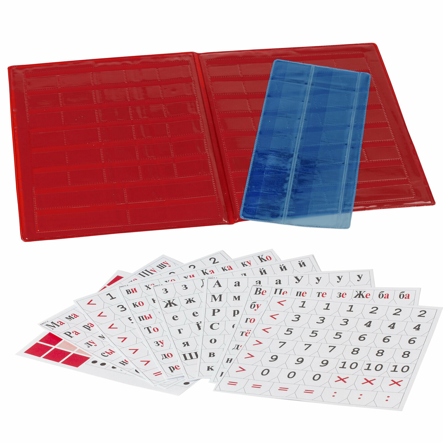 Касса содержит 8 бумажных карточек формата А5 с напечатанными на них буквами, цифрами, математическими знаками, которые предварительно нужно вырезать для дальнейшего использования. Вырезанные элементы удобно размещаются и хранятся в папке из ПВХ со специальными прорезями и прозрачными карманами. Максимальная высота символа 23 мм. Предназначен для детей старше 3-х лет.