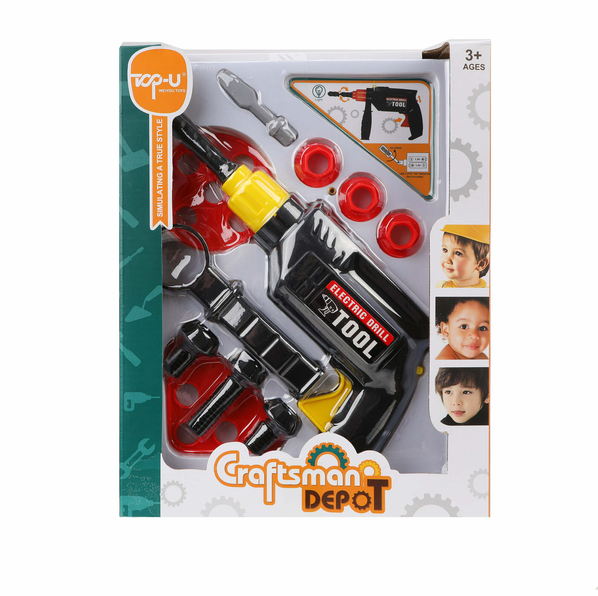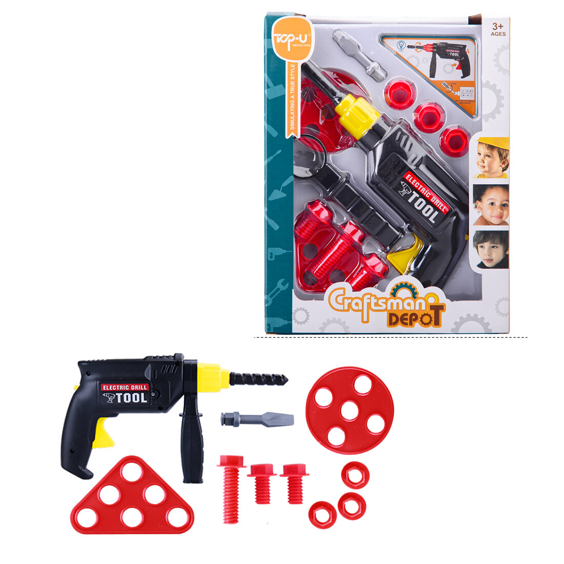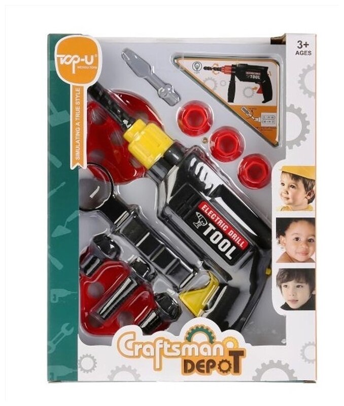 В комплекте - 11 предметов, среди которых мальчик найдёт электрифицированную дрель, 2 насадки к ней, 3 болта, 3 гайки и 2 элемента с круглыми отверстиями. При нажатии на кнопку сверло дрели реалистично вращается с характерным звуком, а индикатор светится красным огоньком.