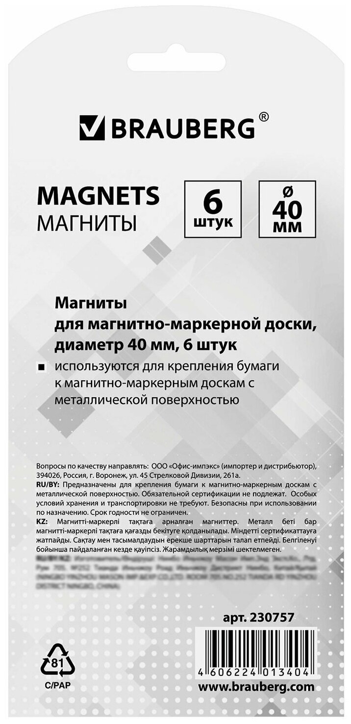 На сегодняшний день товар «Магниты для доски магнитно-маркерная BRAUBERG 230757 разноцветные» можно купить с кешбеком в 1 магазине: Яндекс.Маркет