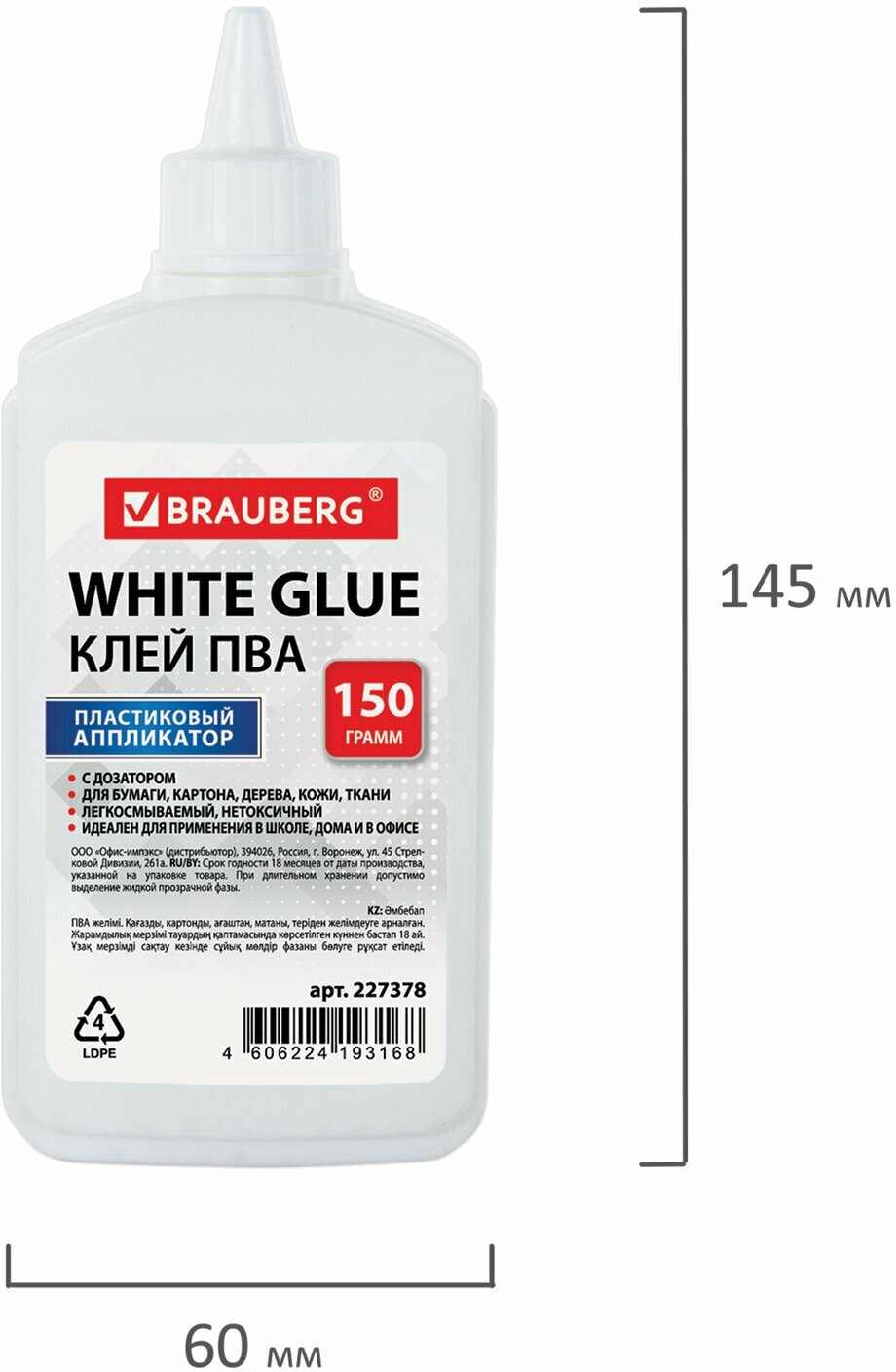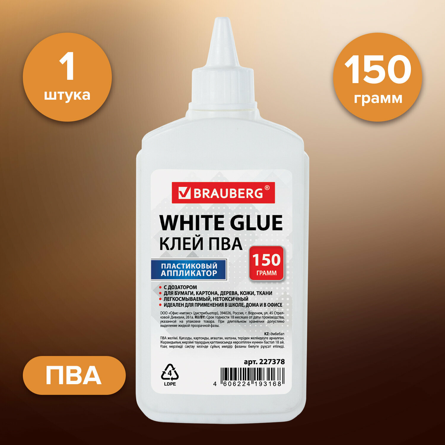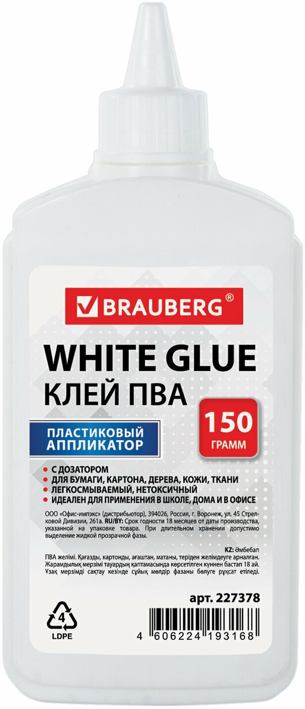 Клей ПВА BRAUBERG (бумага картон дерево) 150 г 227378