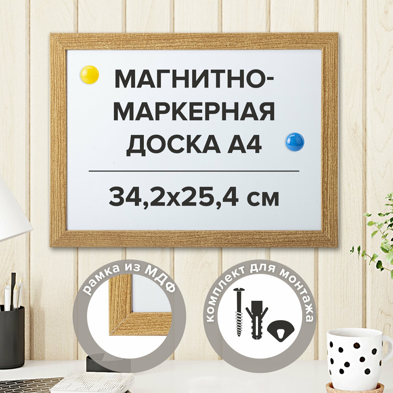 Покрытие позволяет писать специальными маркерами для белой доски. На поверхности доски можно легко размещать информацию при помощи магнитов.