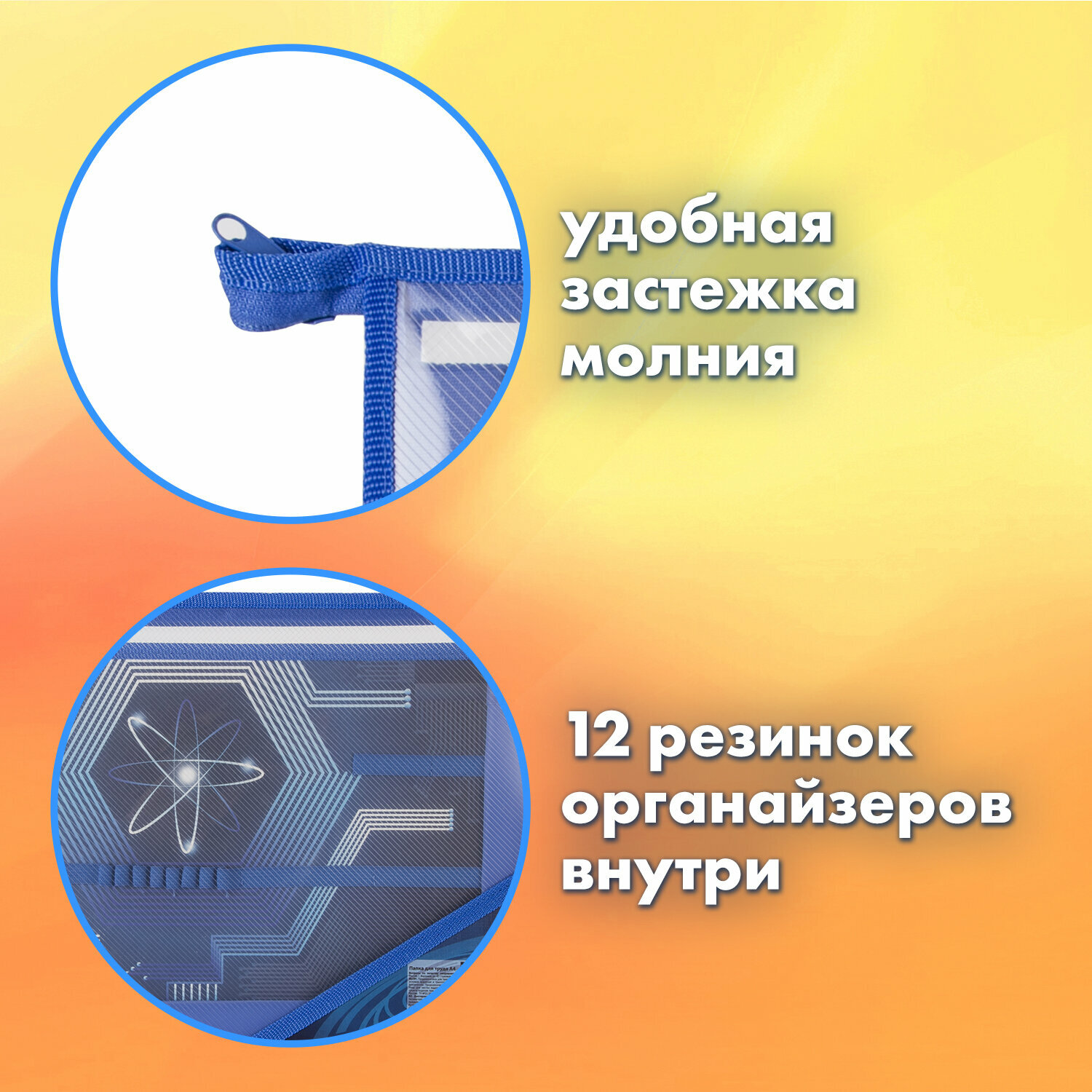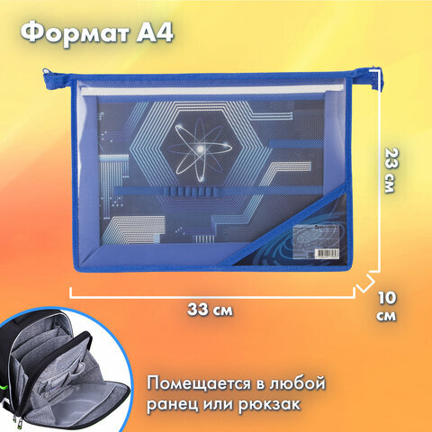 Папка для труда Brauberg "Атом" выполнена из пластика, по краям имеет тканевую окантовку. Внутри папки 2 отделения и внутренний органайзер с креплениями для канцелярских и письменных принадлежностей. Застежка-молния расположена по верхнему краю папки. Яркая и четкая печать дизайна на уголке папки и на перегородке с органайзером.