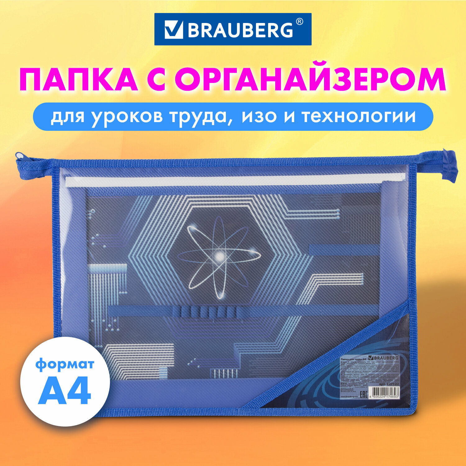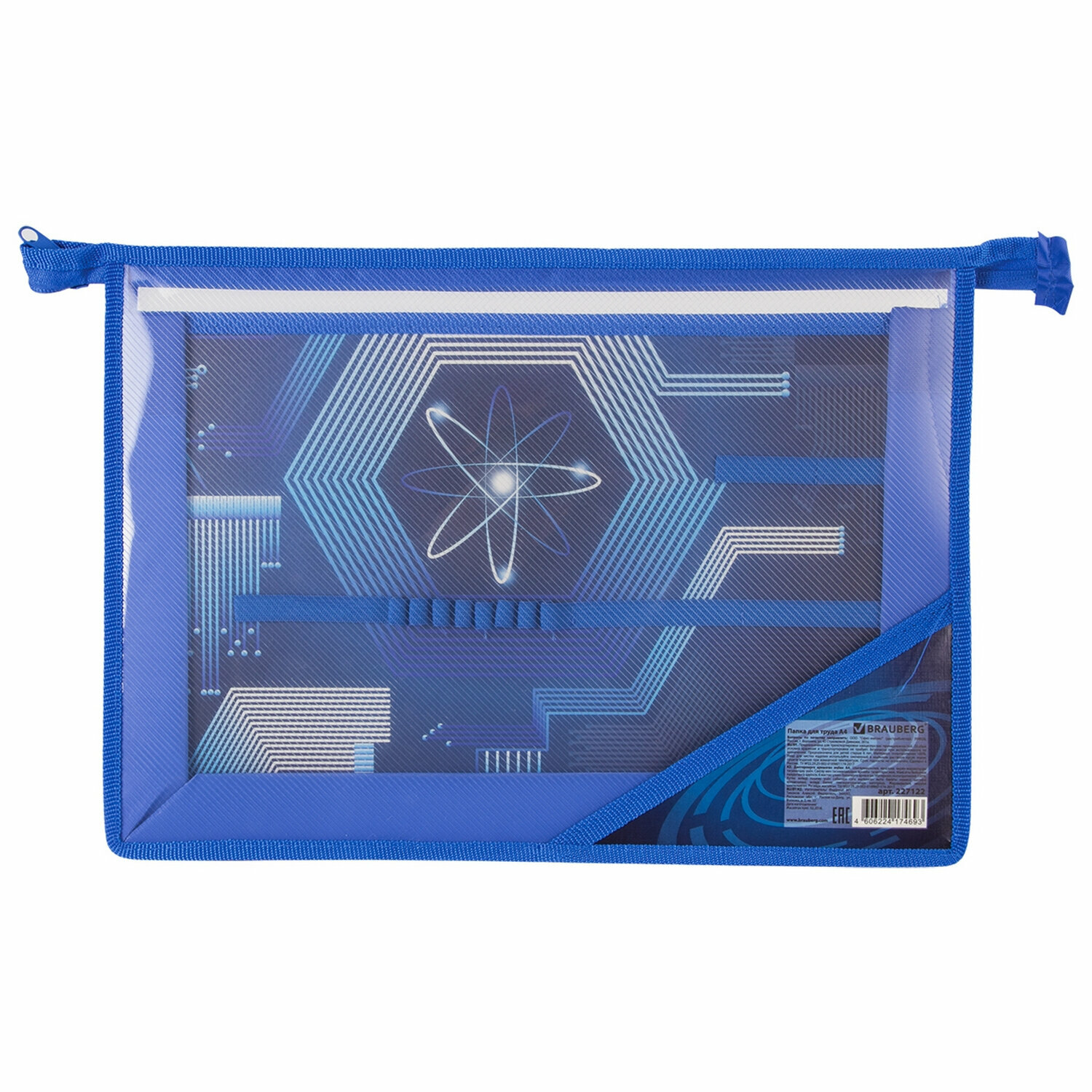 BRAUBERG Папка для труда с молнией сверху А4 Атом синий 227122