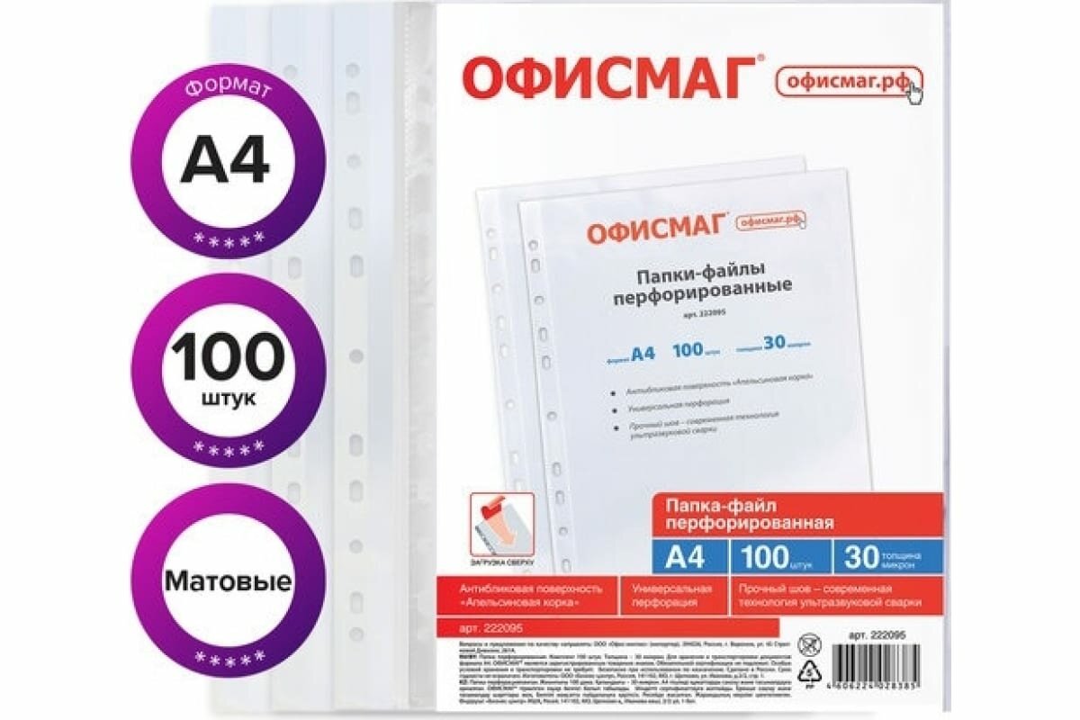 Папки-файлы перфорированные А4 офисмаг комплект 100 шт матовые 30 мкм 222095