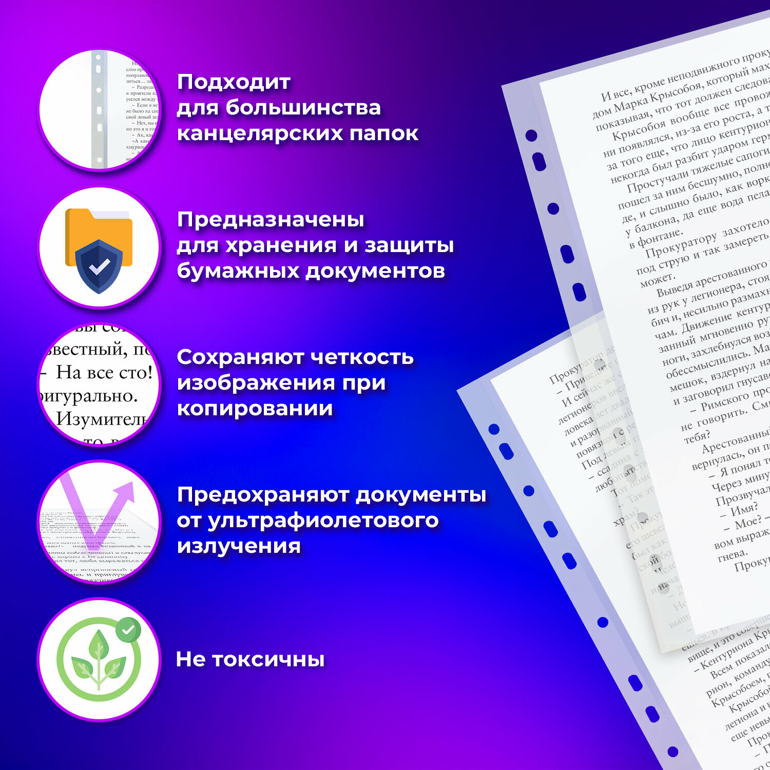 | Прочие особенности и свойства | Прозрачная перфорированная папка-файл ОФИСМАГ совместима с любыми видами архивных папок. Антибликовая поверхность «апельсиновая корка» позволяет копировать документы, не вынимая их из папки. |